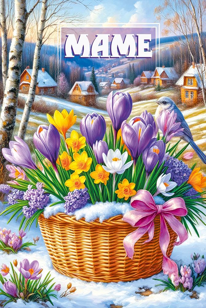 Открытка формата А5 предназначена для поздравлений мамы и ориентирована на использование в розничной продаже и оптовых поставках для магазинов подарков, книжных сетей и универсальных торговых точек. Изделие выполнено из плотного картона, что обеспечивает устойчивость к деформации при транспортировке, хранении и многократном просмотре. Лицевая сторона оформлена цветным изображением: на фоне зимнего сельского пейзажа с домами и берёзами представлена плетёная корзина с весенними цветами и декоративной лентой, в верхней части композиции размещена надпись «МАМЕ». Такое решение делает открытку универсальной для поздравления с 8 Марта, днём рождения и другими семейными событиями. Печать выполнена с применением глянцевого УФ-лака, благодаря чему изображение имеет повышенную стойкость к истиранию, не выцветает при стандартных условиях освещения и сохраняет чёткость деталей при длительном хранении на витрине или складе. Внутри размещён поздравительный текст, что упрощает использование в рознице и сокращает время выбора для конечного покупателя. Готовое изделие имеет длину 182 мм и ширину 122 мм, размеры выдержаны с учётом стандартных почтовых конвертов соответствующего формата, что удобно при пересылке. Плотный картон позволяет открыткам сохранять форму при вертикальной выкладке и штабелировании, а также уменьшает риск заломов по краям при транспортировке оптовых партий. В упаковке 10 экземпляров, что облегчает планирование ассортимента и выкладку сериями по тематике праздника. Открытка подходит для реализации поштучно, для формирования подарочных наборов и использования в качестве дополнения к цветам и сувенирам, обеспечивая стабильное качество исполнения и единый визуальный стиль в материнской поздравительной категории.