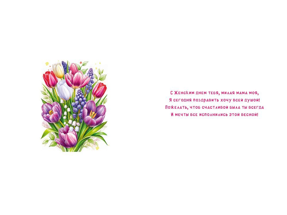 Открытка формата А5 «Маме» изготовлена из плотного картона и рассчитана на интенсивное использование в розничных точках и при оптовых поставках. Размер готового изделия 182×122 мм обеспечивает совместимость с большинством стандартных почтовых конвертов и удобство выкладки на витринах и стеллажах. Двустороннее полноцветное изображение с крупным букетом тюльпанов и весенних цветов хорошо читается с расстояния, что важно при экспозиции в торговом зале и формировании тематических выкладок к праздникам. Лицевая сторона дополнена лаконичной надписью «Маме», позволяющей отнести изделие к универсальной категории поздравительных открыток для Дня матери, дня рождения и других семейных событий. Внутри предусмотрен печатный текст поздравительного характера, что сокращает время выбора для конечного покупателя и снижает потребность в дополнительных сопутствующих товарах. Печать выполнена с применением глянцевого УФ-лака, который повышает стойкость красочного слоя к истиранию, придает изображению выраженный глянец и облегчает сухую чистку поверхности. УФ-лак одновременно улучшает визуальное восприятие рисунка при искусственном и естественном освещении, что удобно при выкладке в витринах с подсветкой. Картонная основа сохраняет форму при длительном хранении в стопках и транспортировке в коробах, не деформируется при стандартных условиях влажности и температуры, что снижает процент брака при оптовых поставках. Толщина и жесткость материала достаточны для самостоятельного вручения без дополнительной подложки, открытка не сгибается и не мнется при аккуратной передаче. Упаковка содержит 10 одинаковых изделий, что упрощает планирование ассортимента, учет остатков и формирование полочных рядов по сезонным и праздничным коллекциям.