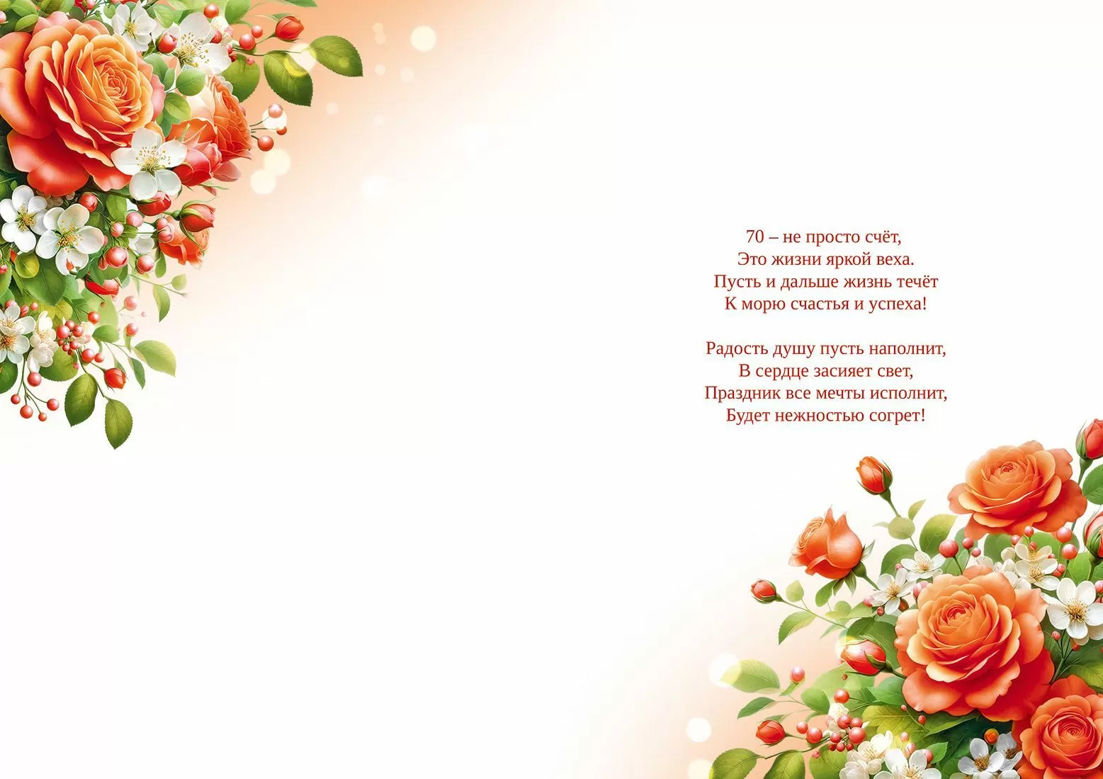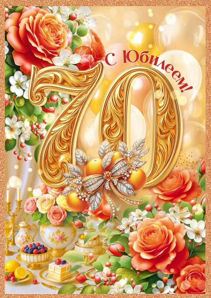 Открытка «С Юбилеем! 70 лет» в формате А4 станет прекрасным дополнением к любому подарку. Изделие с красочным изображением цветов, праздничного торта и роскошного чайного сервиза непременно порадует получательницу. Яркие оранжевые цвета настраивают на позитивный лад, а золотые детали с блестящим покрытием придадут изделию роскошного сияния. Внутри открытки – замечательные стихи с теплыми пожеланиями. Такой презент можно вручить в дополнение к основному подарку, чтобы украсить поздравление и сделать его более оригинальным. Изделие выполнено из качественных материалов, что обеспечивает ему прочность и долговечность, поэтому оно станет чудесным памятным сувениром для получателя.