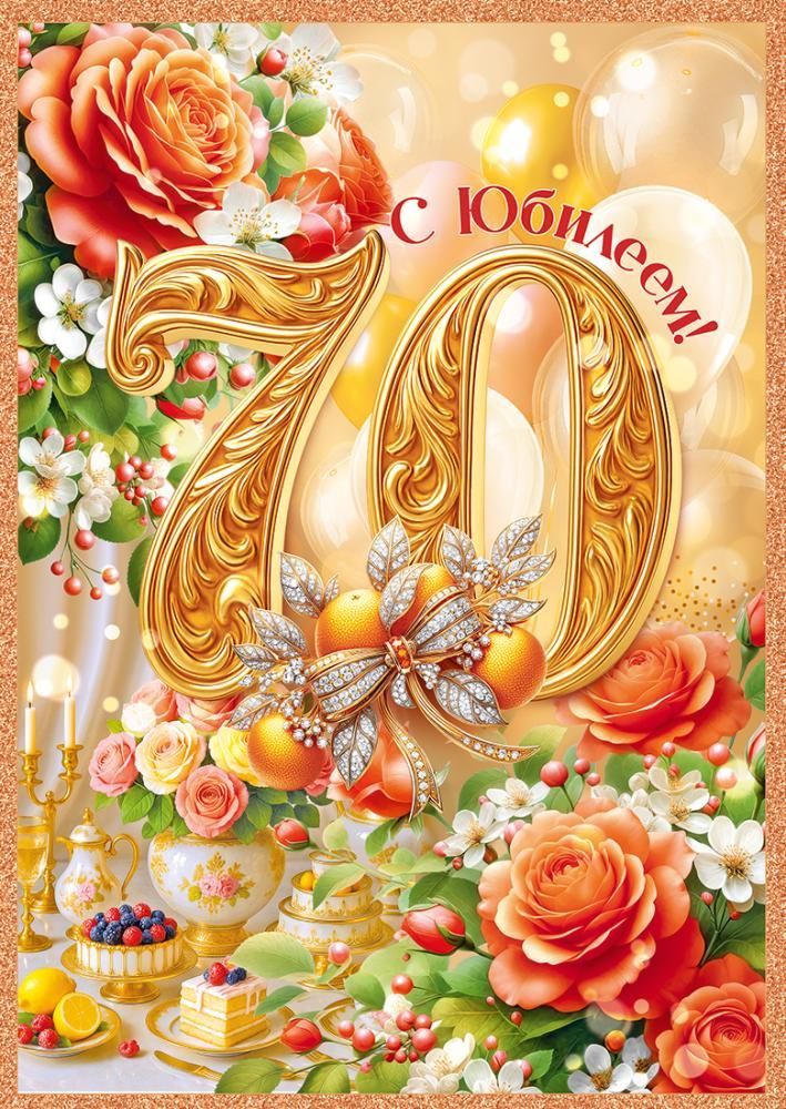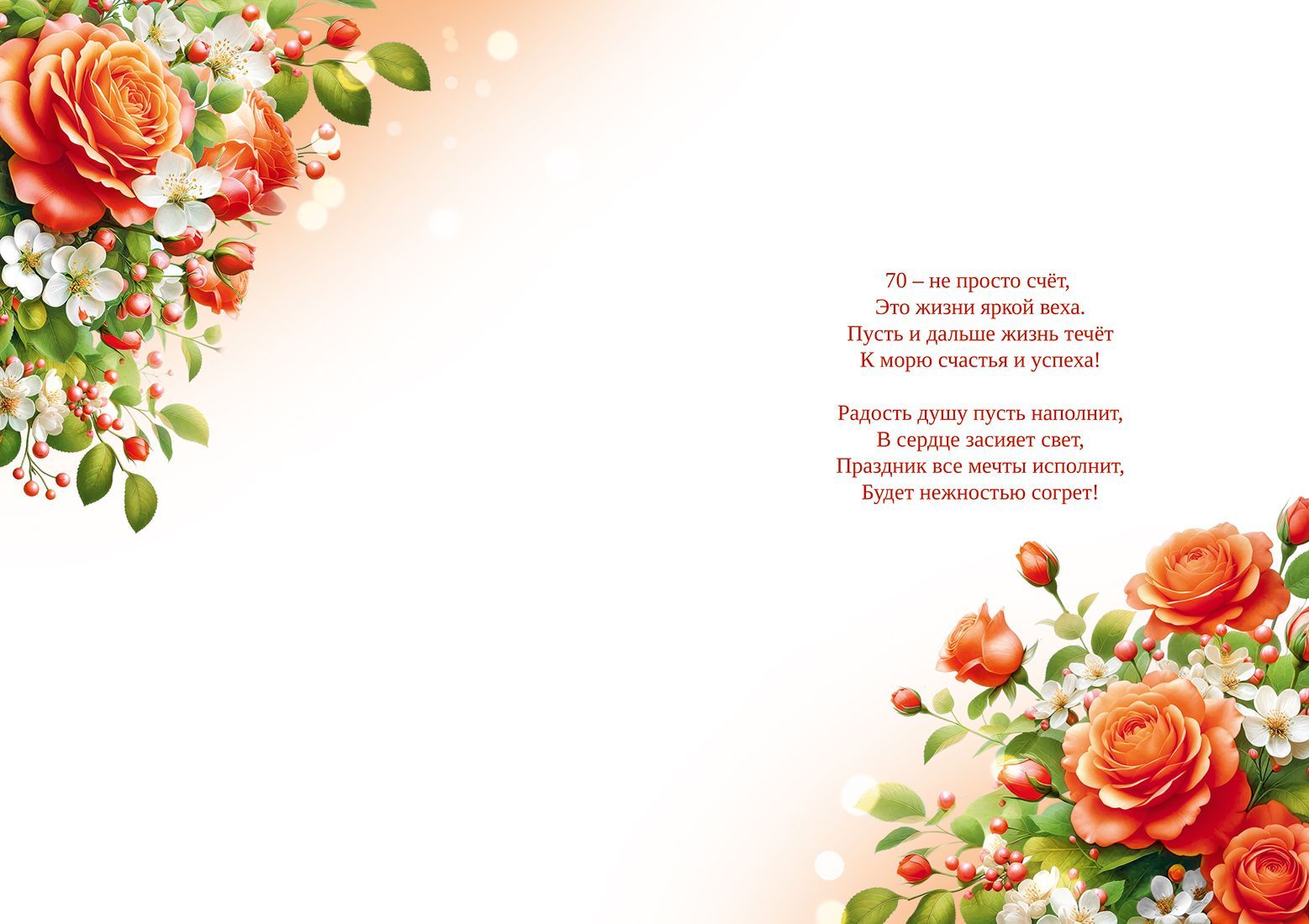 Открытка формата А4 предназначена для поздравления с 70‑летним юбилеем и ориентирована на использование в розничной продаже и оптовых поставках для магазинов подарков, книжных сетей и корпоративных закупок. Основа изделия выполнена из плотного картона, обеспечивающего стабильную геометрию и сохранность формы при транспортировке и длительном хранении в торговых стойках и складских условиях. Готовое изделие имеет размеры 277 × 196 мм, что удобно для размещения в стандартных пакетах и конвертах соответствующего формата, а также для выкладки на полке без дополнительной подрезки или подгонки. Лицевая сторона оформлена крупной золотистой надписью «70» и текстом «С юбилеем!» на фоне композиции из роз, цветущих веток и праздничного стола, что делает открытку универсальной для поздравления как женщин, так и мужчин старшего возраста. Дополнительный визуальный эффект создаёт отделка блестками в лаке золотого цвета: декоративный слой нанесён локально, подчёркивает элементы цифр и цветочные детали, устойчив к осыпанию и не стирается при аккуратном листании, что важно при интенсивном пересмотре товара покупателями. Внутри предусмотрен готовый поздравительный текст, позволяющий использовать открытку без самостоятельного составления пожеланий; при необходимости остаётся свободное место для личной подписи и краткого дополнения. Конструкция сгиба рассчитана на многократное открывание без растрескивания красочного слоя по линии сгиба. Плотность картона и формат способствуют устойчивому положению открытки в раскрытом виде на столе или полке, что удобно при оформлении праздничного интерьера. Упаковка содержит 10 одинаковых экземпляров, что облегчает формирование ассортимента по возрастным линейкам и планирование полочного запаса. Открытки поставляются стопкой, хорошо совмещаются по размеру с типовыми торговыми дисплеями, не требуют специальных условий хранения, выдерживают стандартные условия перевозки без деформации и потери потребительских свойств.