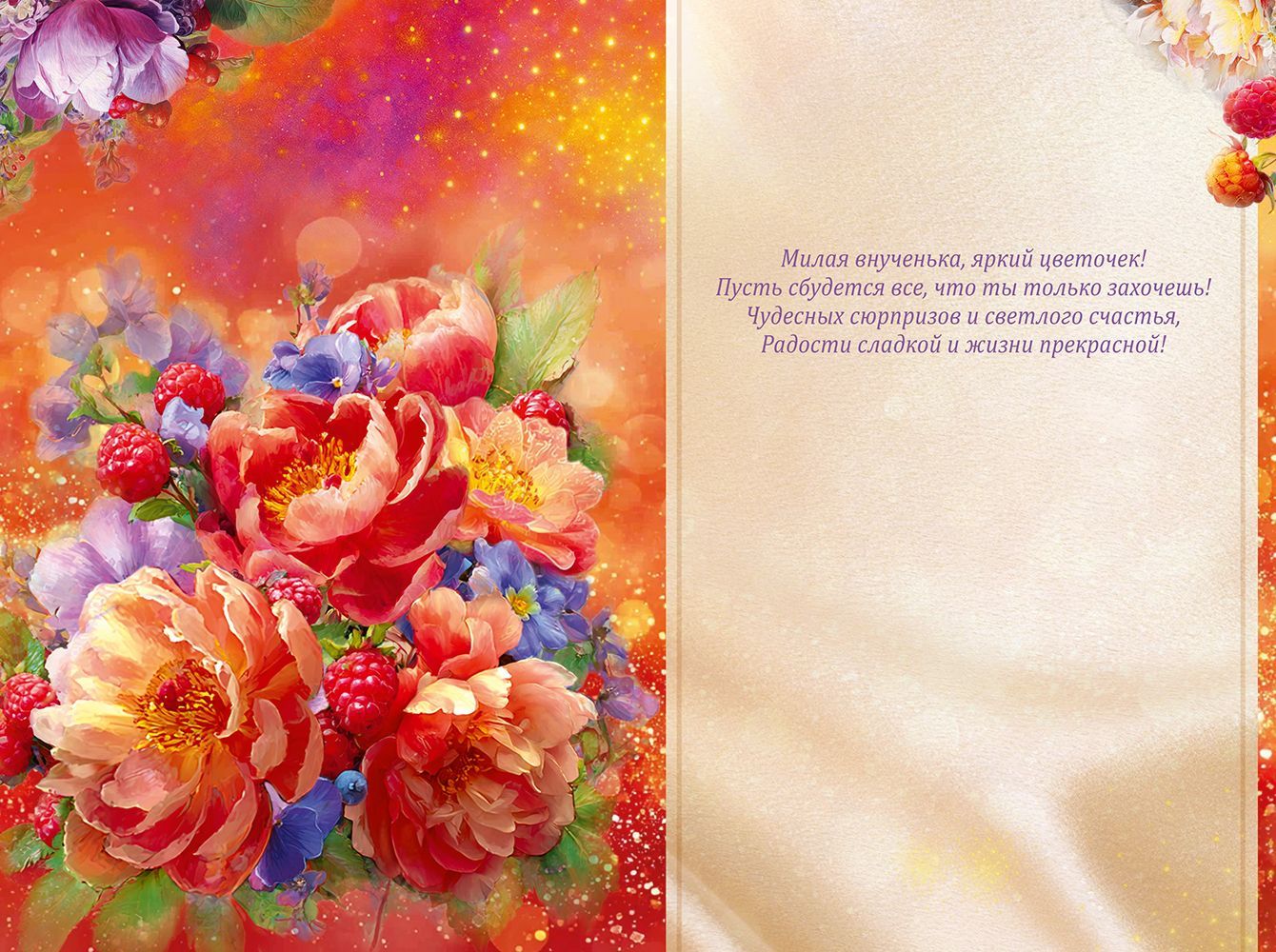 Открытка формата А5 предназначена для поздравления внучки и ориентирована на использование в розничной продаже и оптовых поставках для магазинов подарочной и канцелярской группы. Изделие изготовлено из плотного картона, обеспечивающего стабильную геометрию полотна, устойчивость к сгибам и истиранию при транспортировке, выкладке и хранении. Размеры готового изделия 182 × 122 мм позволяют размещать открытку в стандартных витринных лотках и конвертах соответствующего формата, а также удобно комплектовать сопутствующими товарами праздничного ассортимента. Лицевая сторона оформлена полноцветным изображением крупного цветочного букета с ягодами на теплой переливчатой подложке и содержит надпись «Любимой внучке», за счет чего открытка подходит для поздравления с днем рождения, семейными и календарными праздниками, а также в качестве дополнения к подарку без привязки к конкретной дате. В отделке применены радужные блестки в лаке, создающие декоративный перелив при изменении угла освещения; покрытие нанесено локально, не утолщает поверхность и сохраняет читаемость изображения, при этом лаковый слой повышает стойкость печати к внешним воздействиям. Внутри предусмотрен готовый печатный текст поздравления, что сокращает время подготовки к вручению и делает изделие удобным для покупателей, предпочитающих законченные решения без необходимости писать развернутое послание. Плотный картон хорошо держит сгиб, не растрескивается по линии фальца, что важно для сохранения презентабельного вида при многократном перелистывании в торговом зале. Открытка поставляется в упаковке по 10 штук, что упрощает учет и планирование запасов для оптовых клиентов, позволяет формировать равномерный ассортимент по тематике «семейные поздравления» и оптимизировать выкладку на полке по цветовой и сюжетной группе. Такое исполнение удобно как для единичной покупки, так и для формирования расширенной праздничной витрины с повторяемым дизайном.