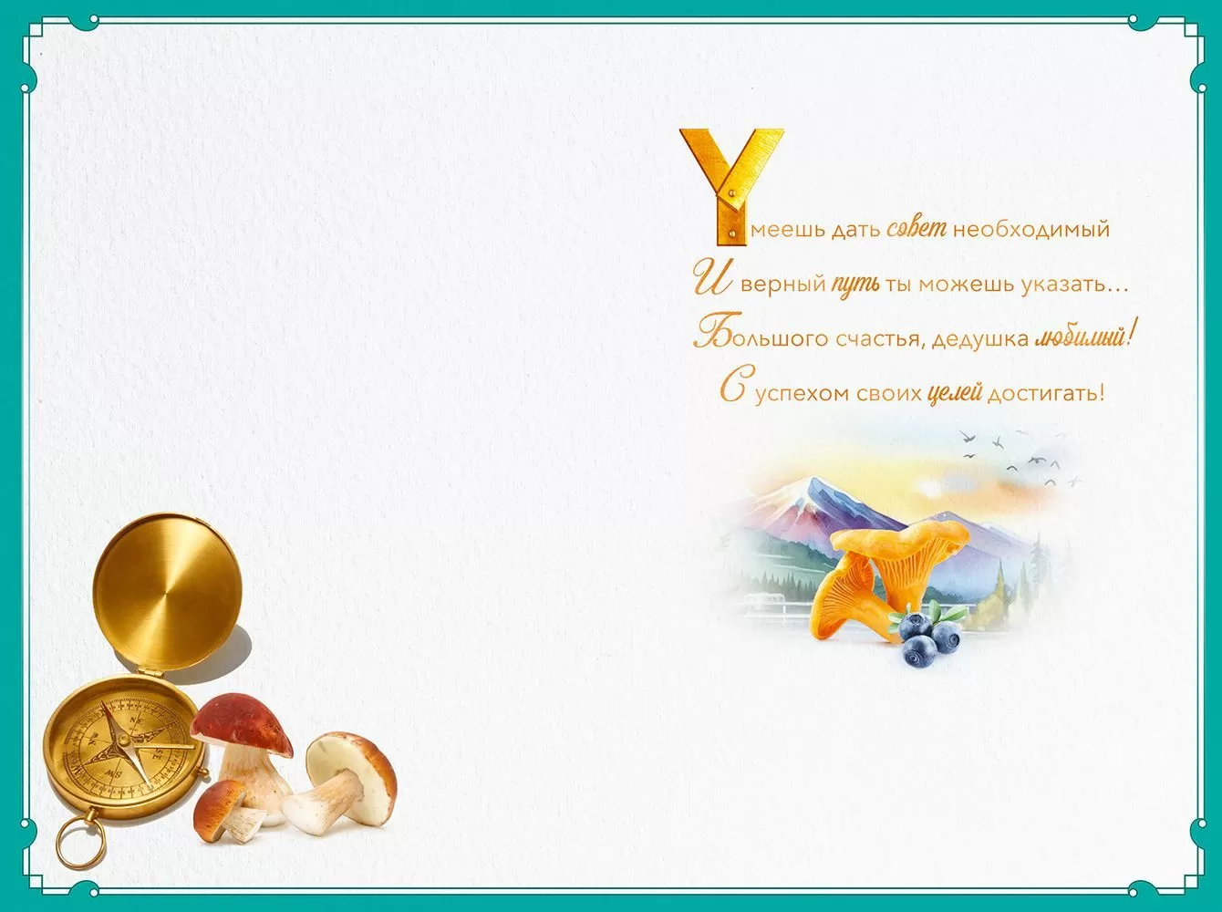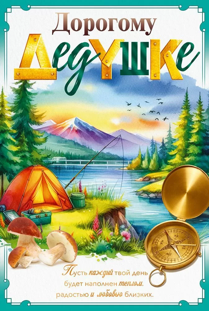 Открытка «Дорогому дедушке» в формате А5 станет прекрасным дополнением к подарку и украсит праздник. Замечательный дизайн обязательно порадует дедушек, любящих природу и активный отдых! На изделии изображен прекрасный пейзаж с видом на величественные горы и речку. Компас на переднем плане лишь дополняет сюжет. Он будет символизировать тягу к приключениям и путешествиям. Внутри открытки – замечательные стихи с теплыми пожеланиями. Такой презент можно вручить в дополнение к основному подарку, чтобы украсить поздравление и сделать его более оригинальным. Изделие выполнено из качественных материалов, что обеспечивает ему прочность и долговечность, поэтому оно станет чудесным памятным сувениром для получателя.