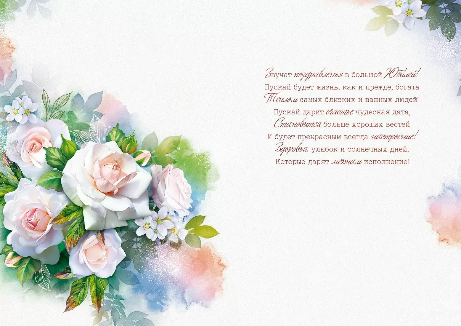 Открытка «С Юбилеем! 80 лет» в формате А4 станет прекрасным дополнением к любому подарку. Элегантный дизайн сделает изделие особенно ярким и запоминающимся. Белоснежные розы составляют центральную композицию изображения, ее дополняют акварельные разводы на фоне. Картинка очень светлая и легкая, она обязательно придется по душе всем! Внутри открытки – замечательные стихи с теплыми пожеланиями. Такой презент можно вручить юбилярше на 80-летие в дополнение к основному подарку. Изделие выполнено из качественных материалов, что обеспечивает ему прочность и долговечность, поэтому оно станет чудесным памятным сувениром для получателя.