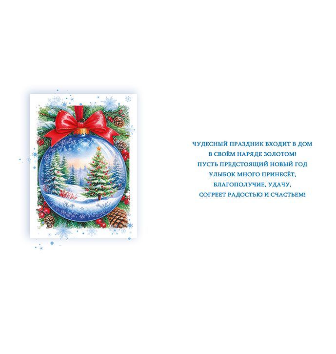 Открытка новогодняя формата «Евро» предназначена для розничной продажи и оптовых поставок в сезонных и постоянных ассортиментных линейках. Изделие выполнено из плотного картона, обеспечивающего стабильную геометрию при транспортировке и хранении, а также устойчивость к изгибам и истиранию в торговом обороте. Готовый размер 204 × 97 мм позволяет использовать открытку в стандартных конвертах соответствующего формата и оптимально размещать на витринах, в кассовых зонах и напольных стойках. Лицевая сторона оформлена новогодней композицией с изображением елочного шара на фоне зимнего пейзажа, хвойных веток, шишек и декоративных ягод, на золотистом фоне размещено поздравление «С Новым годом!». Для повышения износостойкости и визуальной выразительности применена комбинированная отделка: глянцевый УФ-лак защищает красочный слой от механических повреждений и придает изображению выраженный блеск, золотая фольга акцентирует отдельные элементы дизайна и делает открытку заметной в выкладке. Внутри размещен готовый поздравительный текст, что сокращает время обслуживания покупателей и упрощает выбор конечного пользователя: открытка подходит для дарения коллегам, партнерам, клиентам, друзьям и родственникам без необходимости самостоятельного составления пожеланий. Материал и формат обеспечивают удобство штабелирования, фасовки и упаковки, изделие не занимает много места на складе и в торговом зале, подходит для формирования широкого новогоднего ассортимента в едином стиле. В одной упаковке 10 штук, что удобно для планирования закупок, формирования партий по сетям и равномерного распределения по торговым точкам. Открытка может использоваться как самостоятельный сувенир либо как дополнение к подарку, уместна в корпоративных поздравлениях и частном использовании.