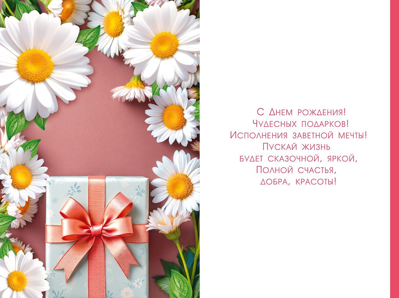 Открытка поздравительная формата А5 предназначена для оформления индивидуальных поздравлений с днём рождения и использования в розничной продаже и оптовых поставках. Изделие изготовлено из плотного картона, что обеспечивает стабильную геометрию, устойчивость к изгибам и сохранение внешнего вида при хранении и транспортировке. Лицевая сторона оформлена полноцветным изображением ромашек и подарочной коробки на розовом фоне с надписью «С Днём Рождения!», дополненной блестками в лаке радужными, за счёт чего создаётся аккуратный декоративный эффект при искусственном и естественном освещении без избыточного объёма и утолщения поверхности. Внутри предусмотрен печатный текст поздравления, что позволяет использовать открытку без дополнительной подготовки, оптимизируя время обслуживания в рознице и упрощая выбор конечному покупателю. Габаритные размеры готового изделия 182 × 122 мм обеспечивают совместимость с типовыми почтовыми конвертами и стандартными витринными решениями; формат удобен для выкладки на полках, в напольных и настольных стойках. Картонная основа хорошо выдерживает точечные нагрузки при транспортировке крупными партиями, не деформируется при кратковременном контакте с влагой, пригодна для длительного складского хранения в стеллажных системах. Открытка подходит для поздравления взрослых и детей, уместна в личных и корпоративных сценариях дарения, может дополнять цветы, подарочные наборы и сувениры. Нейтральная цветовая гамма и классический сюжет позволяют включать данную позицию в базовый ассортимент магазинов подарков, книжных сетей, цветочных салонов и канцелярских отделов, обеспечивая стабильный спрос в течение всего года. В упаковке 10.