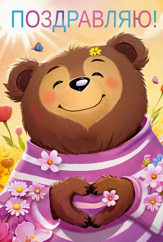 Открытка формата А5 выполнена из плотного картона, обеспечивающего устойчивость к изгибам и истиранию при транспортировке и хранении в оптовых партиях. Габариты готового изделия 182 × 122 мм позволяют использовать стандартные конверты и упаковочные решения, удобно размещать товар в витринах, напольных и настольных дисплеях. Лицевая сторона оформлена полноцветной печатью с изображением медвежонка на цветочном фоне и крупной надписью «Поздравляю!», что делает открытку универсальной для дней рождения, личных праздников, школьных и корпоративных мероприятий. Применена отделка блестками в лаке радужного типа, зафиксированная на поверхности защитным слоем лака; такое исполнение повышает износостойкость изображения, уменьшает риск осыпания декора и сохраняет внешний вид при многократном перекладывании и контакте с руками покупателей. Внутри размещён готовый поздравительный текст, что сокращает время обслуживания в рознице и упрощает выбор для конечного пользователя: открытка сразу готова к вручению, при необходимости остаётся место для личной подписи. Картонная основа хорошо держит сгиб, не растрескивается по линии фальца и сохраняет форму в стандартных условиях складского хранения. Открытка подходит для формирования широкого ассортимента в магазинах подарков, книжных, супермаркетах и интернет‑витринах, легко комбинируется с сопутствующими товарами праздничного оформления. В упаковке 10 штук, что удобно для учёта, планирования полочного пространства и пополнения запасов в оптовом канале.