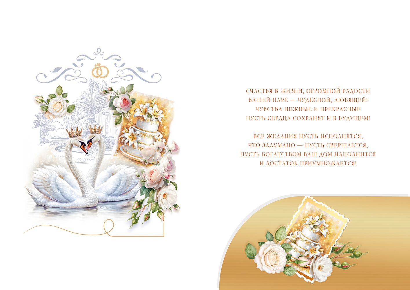 Открытка формата А4 предназначена для поздравления молодожёнов и ориентирована на использование в свадебном ассортименте розничных и оптовых покупателей. Изделие изготовлено из плотного картона, обеспечивающего стабильную форму, устойчивость к изгибам и сохранность внешнего вида при транспортировке и хранении в коробах и на витринах. Готовый размер открытки составляет 277 × 196 мм, что даёт увеличенную площадь для декоративного оформления и делает изделие заметным в выкладке. На лицевой стороне размещена композиция в светло-пастельной гамме с изображением пары лебедей, свадебного торта и цветочных элементов, дополненная надписью «Прекрасным молодожёнам!». Для усиления визуального эффекта применена золотая фольга, выделяющая ключевые элементы дизайна и надписи, а также глянцевый УФ-лак, создающий локальные блики и дополнительную защиту печатного слоя от истирания. Внутри предусмотрен тематический текст поздравления, что сокращает время подготовки к вручению и снижает потребность в дополнительной полиграфии. Конструктив открытки включает карман/клапан для вложения денежных подарков или подарочного сертификата, обеспечивающий аккуратную фиксацию вложения и удобство для получателя. Такое решение делает изделие функциональным элементом подарка и востребованным в свадебных салонах, магазинах подарков и канцелярии. Плотный картон и лаковая отделка позволяют открытке сохранять товарный вид при длительном складском хранении, многократных перекомплектациях и пересылке. В упаковке 10 одинаковых экземпляров, что упрощает планирование закупок, формирование однородных партий и поддержание стабильного ассортимента в сезон повышенного спроса на свадебную продукцию.