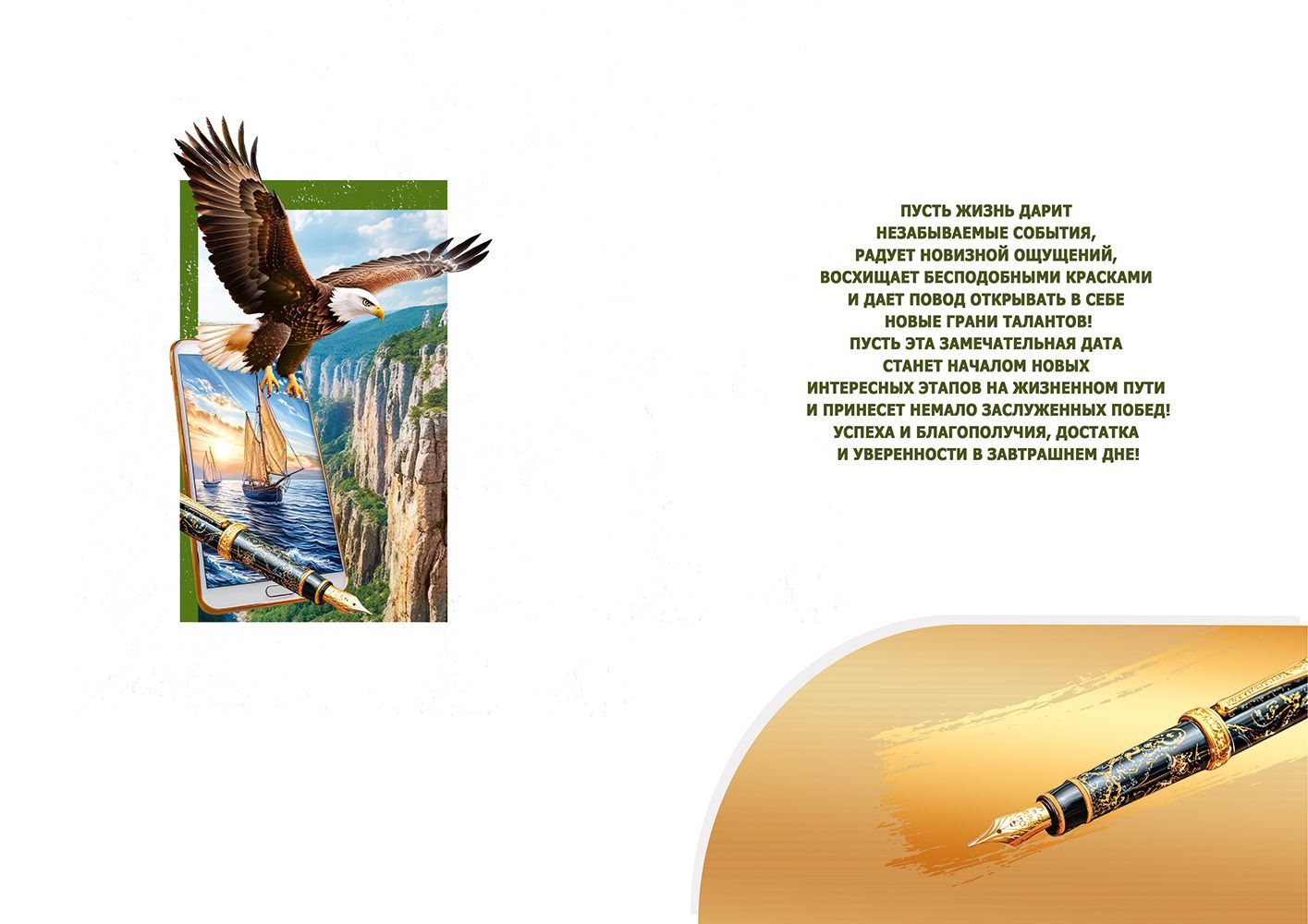 Открытка формата А4 предназначена для поздравления с 50‑летним юбилеем и ориентирована на использование в розничной продаже и оптовых поставках для магазинов подарочной продукции, канцтоваров и корпоративных закупок. Изделие изготовлено из плотного картона, обеспечивающего устойчивость к деформации при транспортировке и хранении, а также аккуратный внешний вид при вручении. Готовый развёрнутый формат открытки составляет 277 × 196 мм, что позволяет разместить крупное визуальное оформление и удобный для чтения поздравительный текст. На лицевой стороне выполнена композиция с крупной надписью «50 С ЮБИЛЕЕМ!» и динамичным изображением орла на фоне горного пейзажа, парусников и элементов городской архитектуры, что делает открытку уместной для поздравления мужчины или делового партнёра. Дополнительный декоративный эффект создаётся за счёт применения золотой фольги и глянцевого УФ-лака: фольга формирует акцент на надписях и отдельных графических деталях, УФ-лак повышает износостойкость печати, защищает от истирания и придаёт поверхности локальный блеск. Внутри открытки размещён уже готовый поздравительный текст, что сокращает время подготовки к вручению и удобно при массовых корпоративных поздравлениях сотрудников или клиентов. Плотный картон хорошо держит сгиб, не растрескивается по линии сгиба и сохраняет геометрию при длительном хранении на полке или в складских коробах. Открытка поставляется по 10 штук, что удобно для планирования оптовых закупок и формирования ассортимента по возрастным юбилеям. Размер и материал позволяют размещать изделие как на настольных, так и на стендовых витринах без дополнительного усиления подложкой. Открытка может использоваться как самостоятельный поздравительный носитель или в комплекте с подарком, подходит для личных, семейных и деловых торжеств, обеспечивая единый визуальный стиль поздравления и предсказуемое качество исполнения в рамках крупной партии.