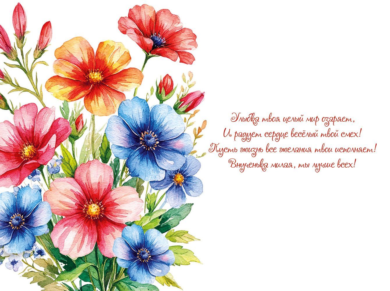 Открытка формата А5 предназначена для поздравления внучки и ориентирована на розничные продажи с возможностью плановой оптовой закупки для сетевой и несетевой розницы, книжных магазинов, киосков и сувенирных отделов. Изделие изготовлено из плотного картона, что обеспечивает стабильную геометрию, сохранность формы и устойчивость к деформации при транспортировке и хранении в стандартных стеллажных и прикассовых выкладках. Готовый размер открытки составляет 182 × 122 мм, что удобно для размещения в типовых конвертах соответствующего формата и позволяет формировать единый ассортиментный ряд с другими поздравительными позициями. Лицевая сторона оформлена цветной печатью с изображением девочки на фоне крупных цветочных элементов; иллюстрация выполнена в яркой, хорошо читаемой гамме и дополнена надписью «Внучке». Отделка нанесена блестками в лаке радужными, за счет чего отдельные фрагменты изображения имеют умеренный декоративный эффект, не влияющий на читаемость текста и не усложняющий укладку в стопы и транспортные короба. Внутри открытки предусмотрен готовый поздравительный текст, что уменьшает время выбора для конечного покупателя и делает изделие пригодным для использования без дополнительного оформления, при этом остается свободное место для личной подписи. Картонная основа устойчива к излому при многократном перелистывании, краска не осыпается при стандартных условиях эксплуатации и не переходит на соседние изделия в пачке. Открытка поставляется в количестве 10, что удобно для формирования полочного запаса, планирования сезонных выкладок к дням рождения и семейным праздникам, а также для включения позиции в комплексные заказы с другими товарами поздравительного ассортимента. Изделие подходит для дарения внучке дошкольного и младшего школьного возраста, может использоваться как самостоятельный знак внимания или как дополнение к подарку.