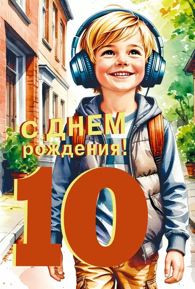 Открытка «С Днем рождения! 10» в формате А5 станет прекрасным дополнением к подарку и украсит собой детский праздник. Авторский дизайн, выполненный в стиле акварельного рисунка, обязательно порадует маленького именинника! Изделие украшено изображением очаровательного паренька в больших наушниках, который идет по городской улице и весело смотрит вперед. Внутри открытки – замечательные стихи с теплыми пожеланиями. Такой презент можно вручить в дополнение к основному подарку, чтобы украсить поздравление и сделать его более оригинальным. Изделие выполнено из качественных материалов, что обеспечивает ему прочность и долговечность, поэтому оно станет чудесным памятным сувениром для получателя.