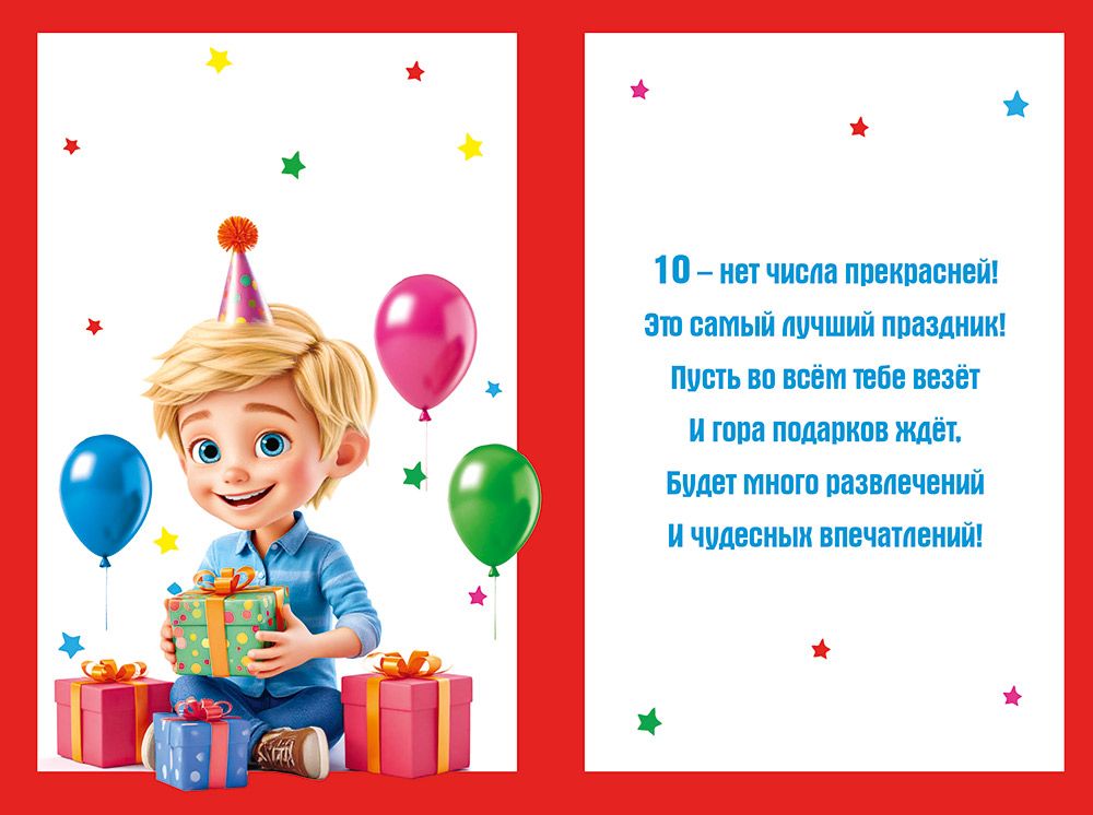 Открытка формата А5 предназначена для поздравления мальчика с десятилетием и ориентирована на использование в розничной продаже и оптовых закупках для магазинов подарков, книжных сетей и торговых точек, работающих с праздничным ассортиментом. Основа изделия выполнена из плотного картона, обеспечивающего стабильную геометрию и сохранение формы при хранении, транспортировке и выкладке в торговом зале. Размер готового изделия 182×122 мм удобен для размещения на стандартных витринах, в настольных и настенных стойках, а также для отправки в конвертах соответствующего формата. Лицевая сторона оформлена яркой полноцветной печатью с крупным числом «10», поздравительной надписью «С днём рождения!» и иллюстрацией мальчика с подарками и воздушными шарами, что однозначно обозначает возраст и тематику поздравления и упрощает выбор конечному покупателю. Открытка выпускается в вариантах без отделки и с глянцевым УФ-лаком, который при наличии создает дополнительную износостойкость лицевой поверхности, защищает изображение от истирания и повышенной влажности, облегчает сухую чистку и делает изделие более устойчивым к частым тактильным контактам при просмотре на витрине. Внутри расположен заранее напечатанный текст поздравления, что сокращает время подготовки к празднику и особенно удобно для закупок в детские центры, школы, кружки и организации, где требуется быстрое оформление большого количества однотипных поздравлений. Плотный картон позволяет открытке уверенно стоять на горизонтальной поверхности при частичном сгибе, что важно при оформлении праздничного стола или подарочной зоны. Стандартная прямоугольная форма облегчает штабелирование, упаковку и учет на складе, а также использование в готовых подарочных наборах. В одной упаковке 10 одинаковых открыток, что удобно для планирования оптовых поставок, формирования серийных выкладок и поддержания стабильного ассортимента в сезон детских дней рождения.