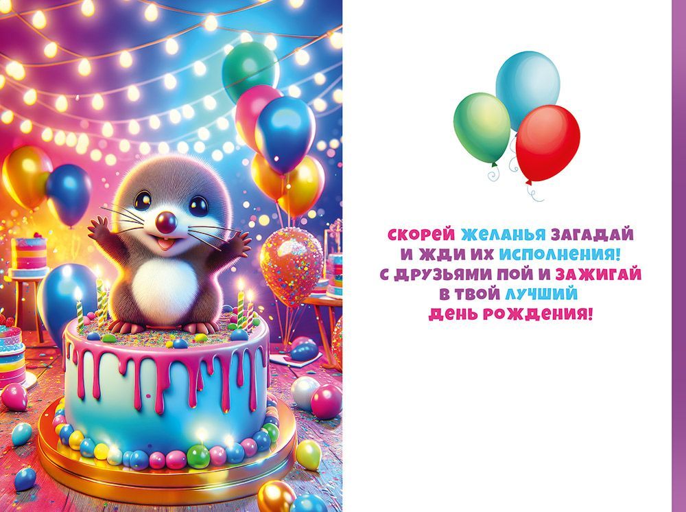 Открытка формата А5 предназначена для поздравления с днём рождения и ориентирована на использование в розничной продаже и оптовых поставках для магазинов подарков, канцелярии и сетевой розницы. Изделие изготовлено из плотного картона, что обеспечивает устойчивость к изгибам, сохранение формы при транспортировке и хранении, а также аккуратный внешний вид на полке. Готовый размер открытки составляет 182 × 122 мм, что удобно для стандартных конвертов соответствующего формата и позволяет разместить внутри разборчивый поздравительный текст от отправителя. На лицевой стороне размещена полноцветная иллюстрация с ярким праздничным тортом, шарами и персонажем, а также крупная надпись «С Днём Рождения!», хорошо читаемая с расстояния и подходящая для выкладки в витрине. Внутри предусмотрен готовый поздравительный текст, что сокращает время выбора и упрощает использование в потоке покупателей, особенно при импульсных покупках у кассовой зоны. Открытка выпускается с вариантами отделки: без отделки и с глянцевым УФ-лаком, что позволяет формировать дифференцированный ассортимент по ценовым уровням и визуальному эффекту. Глянцевое покрытие повышает стойкость изображения к истиранию, придаёт цветам насыщенность и облегчает уход за поверхностью, а исполнение без отделки может использоваться в коллекциях с более сдержанным оформлением. Количество в упаковке — 10, что удобно для оптовых закупок, планирования выкладки и учёта остатков. Плотный картон и стабильные размеры обеспечивают совместимость с типовыми торговыми стеллажами и настольными дисплеями, а также позволяют хранить продукцию стопками без деформации. Открытка подходит для поздравления детей и взрослых, может использоваться как самостоятельный элемент подарка или в дополнение к сувенирам и сладким наборам, формируя универсальное решение для дня рождения в розничном и корпоративном сегментах.