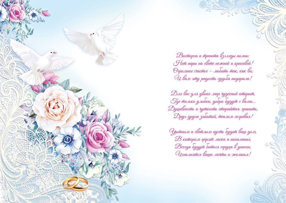 Открытка формата А4 «В день свадьбы» предназначена для оформления поздравлений с регистрацией брака и проведения свадебных мероприятий. Изделие изготовлено из плотного картона, что обеспечивает достаточную жесткость, устойчивость к деформации при транспортировке и хранении, а также аккуратный внешний вид при передаче адресату. Габариты готового изделия составляют 277 × 196 мм, формат удобен для размещения развернутого поздравительного текста и подписи, при этом открытка помещается в стандартные подарочные пакеты и папки. Лицевая сторона оформлена полноцветной печатью с изображением свадебной композиции: белые голуби, цветы, обручальные кольца, декоративные кружевные элементы. Отделка выполнена блестками в лаке радужными, за счет чего отдельные фрагменты рисунка имеют легкий мерцающий эффект и остаются устойчивыми к истиранию при аккуратном использовании. Внутри размещен готовый поздравительный текст, что сокращает время обслуживания покупателей в розничной точке и упрощает выбор для конечного пользователя; при необходимости остается достаточно свободного места для личной подписи. Открытка поставляется в количестве 10, что удобно для оптовых закупок, формирования ассортимента свадебной группы и планирования сезонных продаж. Плотный картон и стандартный формат позволяют хранить пачки вертикально или горизонтально без риска заломов и сминания, изделие совместимо с типовыми конвертами и упаковкой для подарочной полиграфии. Открытка может использоваться в свадебных салонах, магазинах подарков, канцелярских и книжных магазинах, а также в качестве дополнительной позиции к букетам и сувенирной продукции, обеспечивая стабильный спрос в период проведения свадеб и торжественных регистраций.