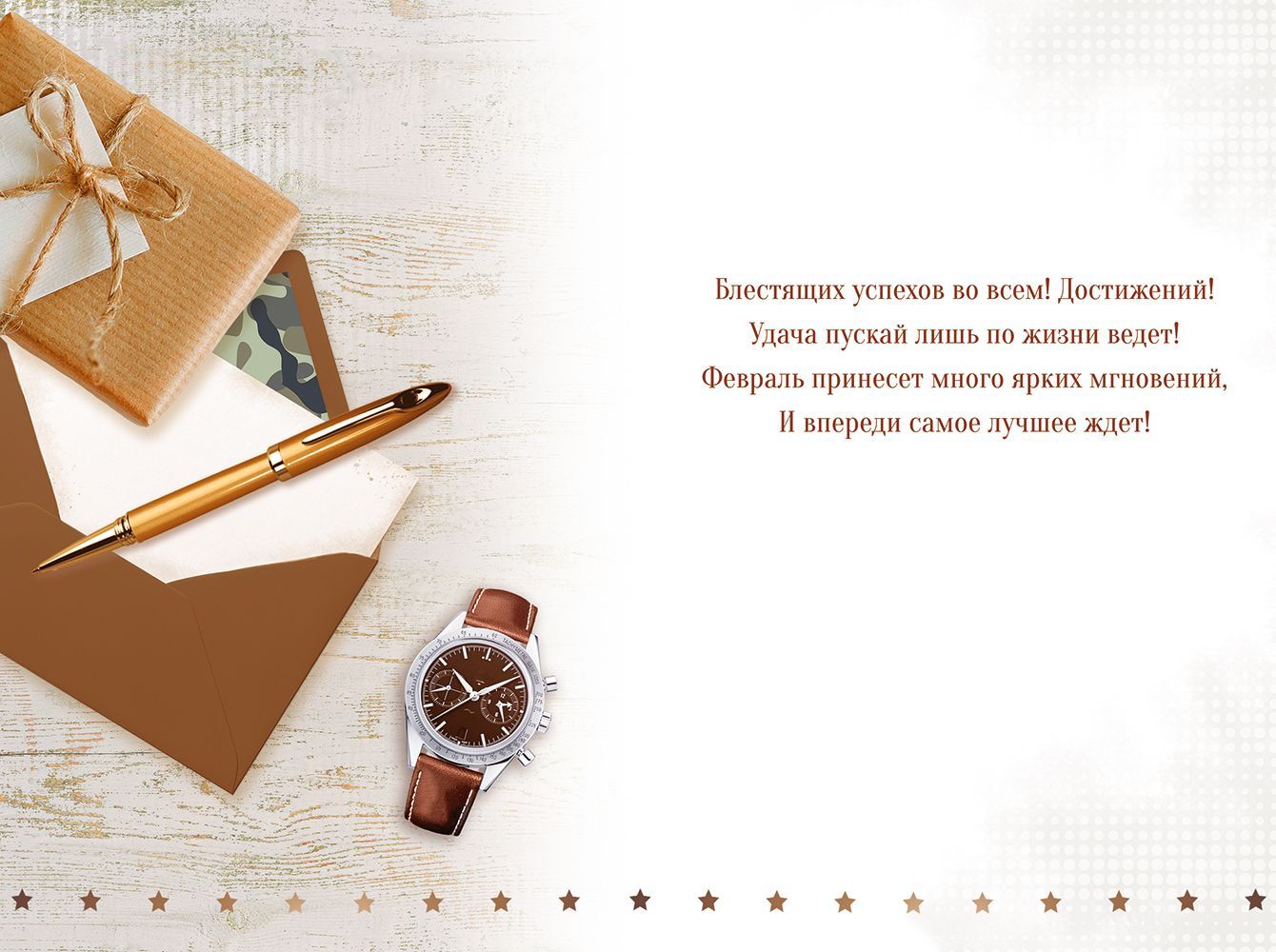 Открытка формата А5 предназначена для поздравления с 23 Февраля и ориентирована на вручение мужчинам, что отражено в оформлении и тексте «Настоящему мужчине». Изделие изготовлено из плотного картона, обеспечивающего стабильную геометрию, устойчивость к изгибам и сохранность внешнего вида при транспортировке и хранении в складских условиях. Прямоугольная форма с готовыми размерами 182 × 122 мм удобна для стандартных конвертов и выкладки на полке, в напольных и настольных стойках, а также в почтовых отправлениях. Лицевая сторона содержит полноцветное изображение с крупным акцентом на дате праздника и тематическими элементами — конвертом, подарочной упаковкой, часами и ручкой, что делает открытку универсальной для поздравления коллег, партнёров, клиентов, родственников и друзей. Внутри расположен готовый поздравительный текст, позволяющий использовать изделие без дополнительной доработки, что важно при массовых корпоративных закупках и ускоряет подготовку к праздничным мероприятиям. Печать выполняется на картоне с гладкой поверхностью, что обеспечивает чёткое воспроизведение мелких деталей и читаемость шрифта, а также допускает внесение от руки имени адресата, подписи и индивидуальных пожеланий. В упаковке 10 одинаковых открыток, что удобно для формирования розничного ассортимента и планирования оптовых поставок по количеству сотрудников или клиентов. Компактный формат и стандартная толщина картона позволяют рационально использовать складское пространство, укладывать упаковки в коробки без деформации и минимизировать риск повреждений при перевозке. Открытка подходит для использования в офисах, магазинах, учебных и государственных учреждениях, где требуется единый стиль поздравлений и предсказуемое качество исполнения.