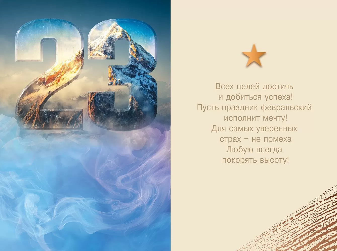 Открытка «23 Февраля! С праздником настоящих мужчин!» в формате А5 станет прекрасным дополнением к подарку и украсит собой февральский праздник. На изделии изображены величественные горы в облачном тумане, а на их фоне – все неотъемлемые атрибуты успешной и стильной жизни: книга, наручные часы, галстук-бабочка и ручка. Внутри открытки – замечательные стихи с пожеланиями. Такой презент можно вручить в дополнение к основному подарку, чтобы украсить поздравление и сделать его более оригинальным. Изделие выполнено из качественных материалов, что обеспечивает ему прочность и долговечность, поэтому оно станет чудесным памятным сувениром для получателя.