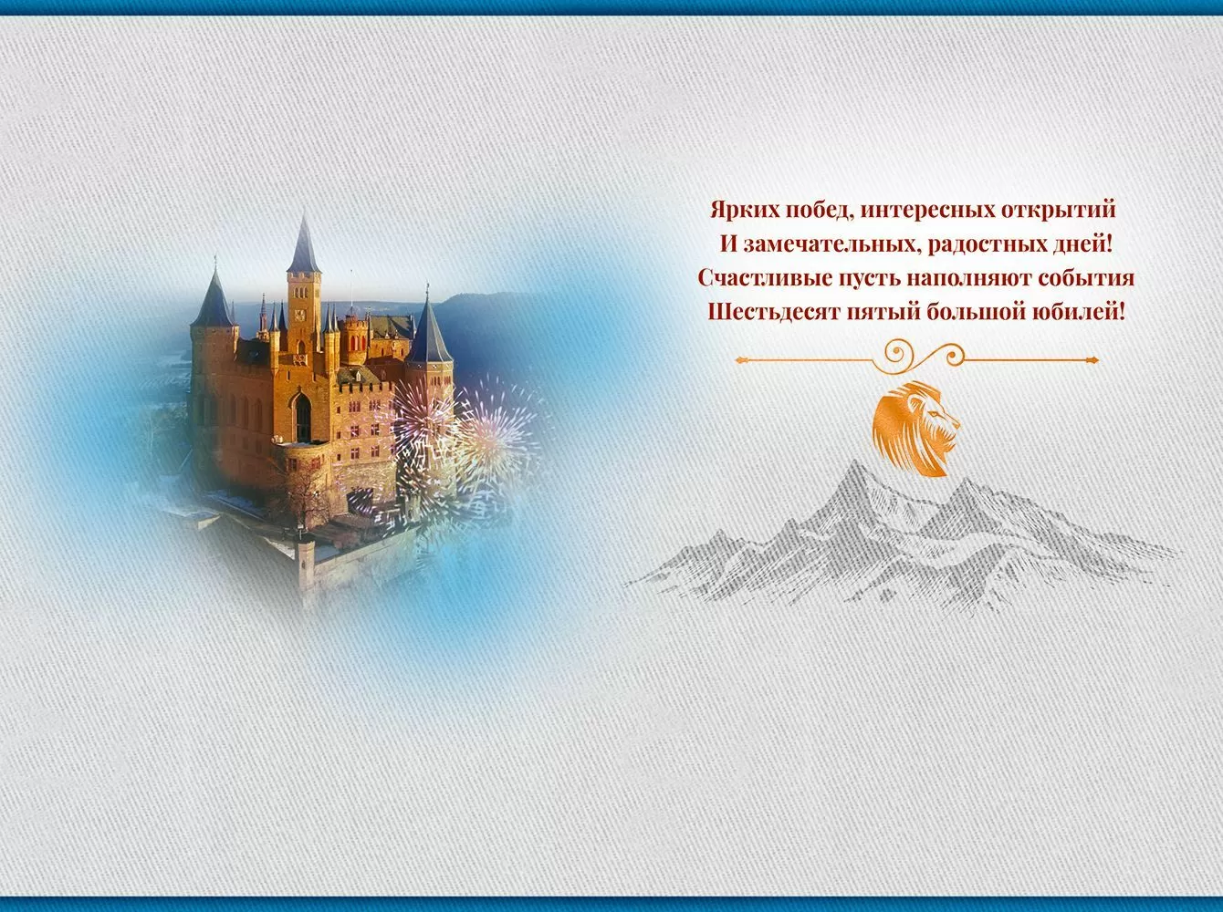 Открытка «С Юбилеем! 65 лет» в формате А5 станет прекрасным дополнением к подарку и украсит собой замечательный праздник. Основу композиции составляет изображение цифры «23», сквозь которое, как сквозь окно, можно увидеть обескураживающие виды на горы, замки, леса и моря. Идеальный подарок для любителей путешествовать в поисках новых впечатлений. Внутри открытки – замечательные стихи с пожеланиями. Такой презент можно вручить в дополнение к основному подарку, чтобы украсить поздравление и сделать его более оригинальным. Изделие выполнено из качественных материалов, что обеспечивает ему прочность и долговечность, поэтому оно станет чудесным памятным сувениром для получателя.