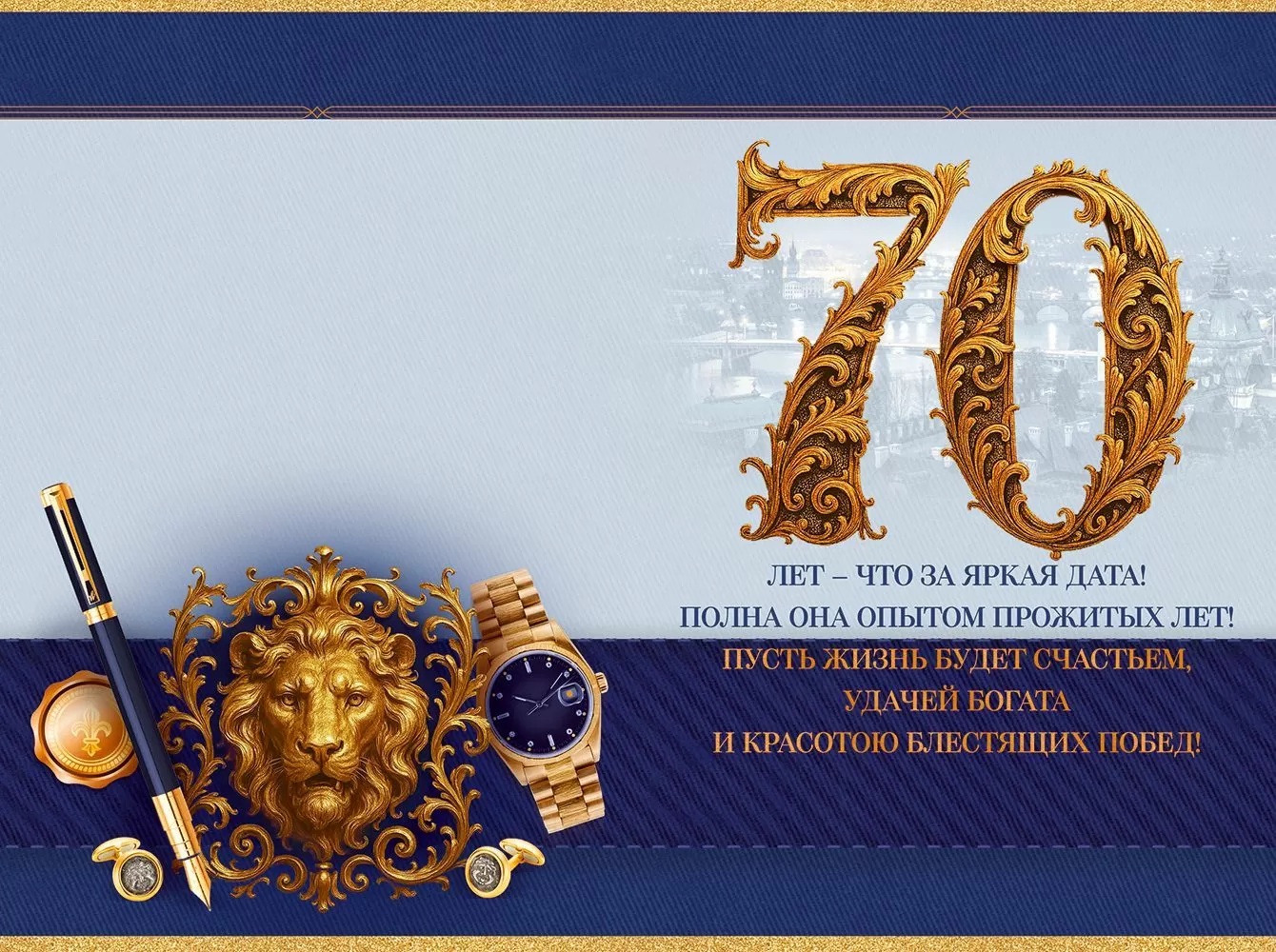 Открытка «С Юбилеем! 70 лет» в формате А5 станет прекрасным дополнением к подарку и украсит праздник. Выполненный в фиолетовых и золотых оттенках, красочный дизайн поражает воображение! Крупная цифра «70» с объемными вензелями изображена на фоне ночного города, полного огней и тайн. Голова золотого льва, изображенного снизу, символизирует величие и достоинство именинника, а наручные часы, запонки и ручка дополняют этот сюжет. Внутри открытки – замечательные стихи с пожеланиями. Такой презент можно вручить в дополнение к основному подарку, чтобы украсить поздравление и сделать его более оригинальным. Изделие выполнено из качественных материалов, что обеспечивает ему прочность и долговечность, поэтому оно станет чудесным памятным сувениром для получателя.