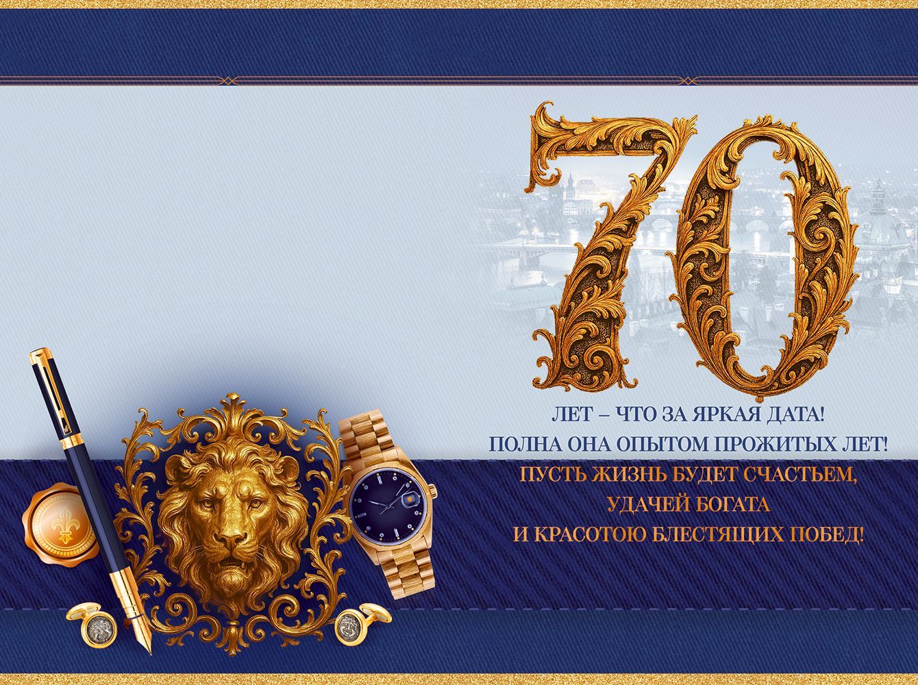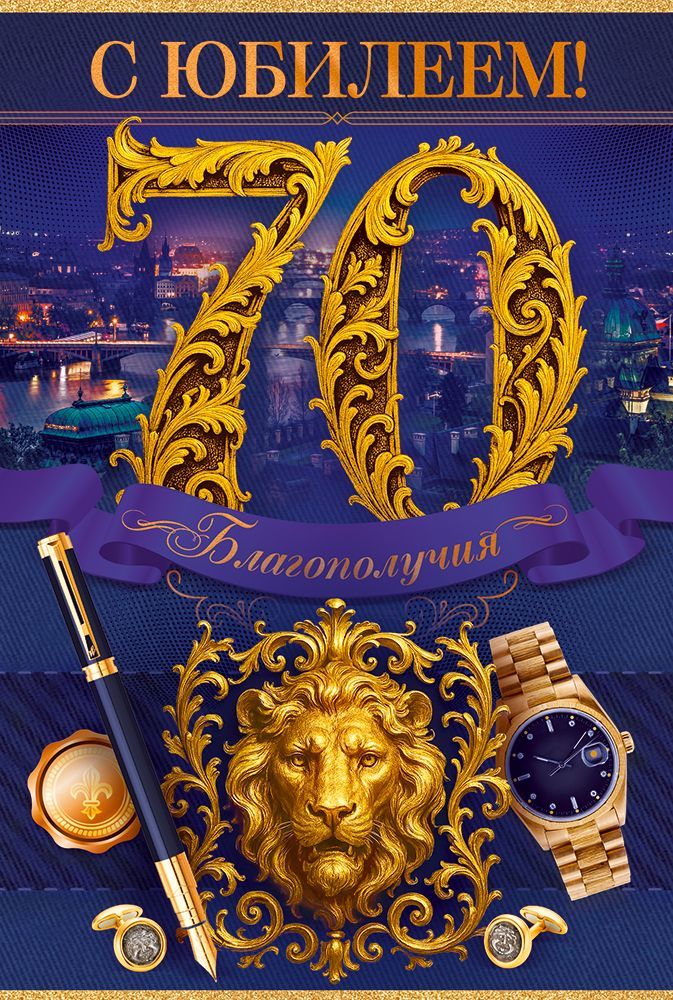 Открытка формата А5 предназначена для поздравления с 70‑летним юбилеем и ориентирована на использование в деловой и частной сфере. Изделие изготовлено из плотного картона, что обеспечивает устойчивость к изгибам, сохранение формы и внешнего вида при транспортировке и хранении на складе, в торговом зале или при пересылке в почтовых конвертах соответствующего формата. Лицевая сторона оформлена в темно‑синей цветовой гамме с контрастными золотистыми декоративными элементами: крупным числом «70», надписью «С юбилеем!» и центральной композицией с изображением льва, часов, перьевой ручки и печати, визуально отсылающих к статусной, солидной атрибутике. Такое решение делает открытку универсальной для поздравления мужчин старшего возраста — руководителей, партнеров, коллег, родственников. Внутри размещен готовый поздравительный текст с акцентом на благополучие и успех, что сокращает время подготовки к вручению и удобно при массовых корпоративных поздравлениях, когда требуется единый стиль оформления. Габариты готового изделия 182 × 122 мм позволяют использовать стандартные конверты, оптимизировать логистику и выкладку на полке, а также рационально организовать хранение партий товара. Поверхность без отделки облегчает маркировку, нанесение штрихкодов, складских пометок или индивидуальной подписи от руки, при этом печать остается устойчивой к истиранию при обычной эксплуатации. Визуальное оформление рассчитано на восприятие как самостоятельного подарочного атрибута, так и дополнения к основному презенту, что расширяет сценарии применения открытки в розничной и корпоративной практике. В упаковке 10 штук, что удобно для оптовых закупок, формирования ассортимента поздравительной продукции и планирования сезонного спроса на юбилейные даты.