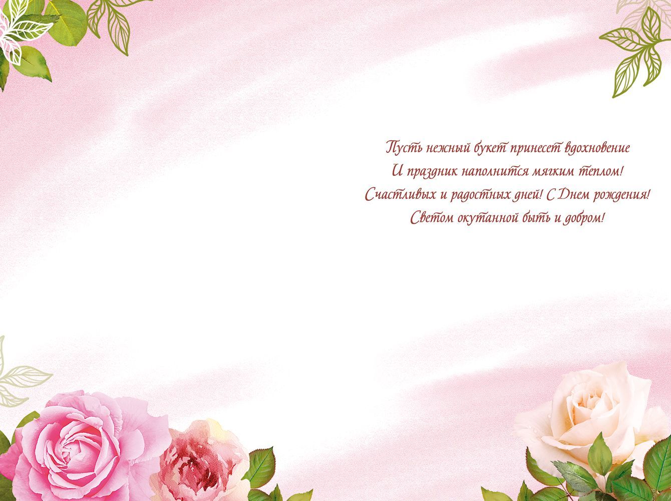 Открытка формата А5 с текстом «С Днём рождения!» выполнена из плотного картона и предназначена для универсального использования в розничном и оптовом ассортименте. Лицевая сторона содержит полноцветное изображение букета роз в розово-кремовой гамме на светлом фоне с растительными элементами, что делает оформление нейтральным и подходящим для поздравления женщин и мужчин разных возрастных категорий в личных и деловых ситуациях. Внутри предусмотрен готовый поздравительный текст, что сокращает время подготовки к вручению и удобно для мест с высокой проходимостью клиентов: магазинов у дома, киосков, супермаркетов, цветочных салонов, отделов подарочной упаковки. Размер готового изделия 182 × 122 мм обеспечивает совместимость с большинством стандартных почтовых конвертов соответствующего формата и удобен при выкладке на полке, в настольных и настенных стойках, лотках и кассовых зонах. Картонная основа отличается стабильной геометрией, не деформируется при кратковременном изгибе и выдерживает типичные условия транспортировки и хранения на складе, в том числе многократные перегрузки в коробах и групповой упаковке. Гладкая печатная поверхность способствует чёткости изображения и устойчивости красочного слоя к истиранию при аккуратной эксплуатации, а также позволяет при необходимости дописать личное обращение стандартными ручками и маркерами без растекания чернил. Нейтральный по стилю дизайн облегчает формирование расширенного ассортимента поздравительных позиций на одну тематику, упрощает планирование закупок к календарным пиковым датам и обеспечивает предсказуемый спрос в течение всего года. В упаковке 10.