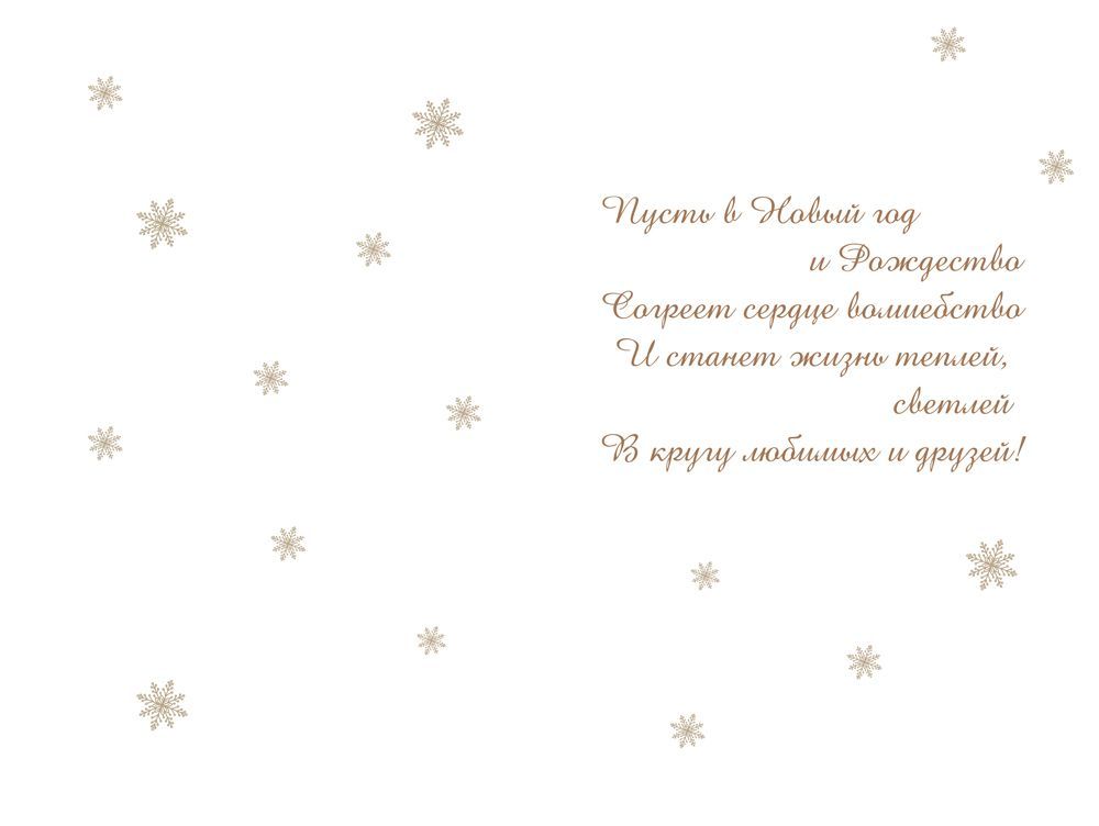 Открытка формата А5 предназначена для оформления новогодних и рождественских поздравлений в розничном и корпоративном сегменте. Основа изделия выполнена из плотного картона, обеспечивающего стабильную геометрию, устойчивость к изгибам и удобство при механизированной или ручной сортировке. Габариты готового изделия составляют 182 × 122 мм, что соответствует стандартным почтовым и упаковочным форматам и упрощает подбор конвертов, транспортных коробов и витринных держателей. На лицевой стороне размещена иллюстрация зимнего пейзажа с храмом и снегирем на еловой ветке, дополненная поздравительным текстом «С Новым годом и Рождеством!». Изображение и надпись частично покрыты радужными блестками в лаке, за счет чего создается выразительный декоративный эффект при искусственном и дневном освещении; при этом лаковый слой служит дополнительной защитой печати от истирания при групповой упаковке, хранении на складе и транспортировке на дальние расстояния. Внутри открытки предусмотрен заранее напечатанный поздравительный текст, что снижает временные затраты при массовой рассылке, формировании подарочных наборов и подготовке корпоративных поздравлений. Картонная основа подходит для нанесения надписей стандартными шариковыми и гелевыми ручками без растекания чернил, что удобно при индивидуализации посланий. Открытка поставляется по 10 штук, что позволяет формировать структурированные партии для оптовых заказов, равномерно заполнять полочное пространство и планировать сезонный ассортимент. Изделие оптимально для использования в магазинах подарочной продукции, книжных и канцелярских отделах, а также в компаниях, организующих поздравления сотрудников, партнеров и клиентов в период зимних праздников.