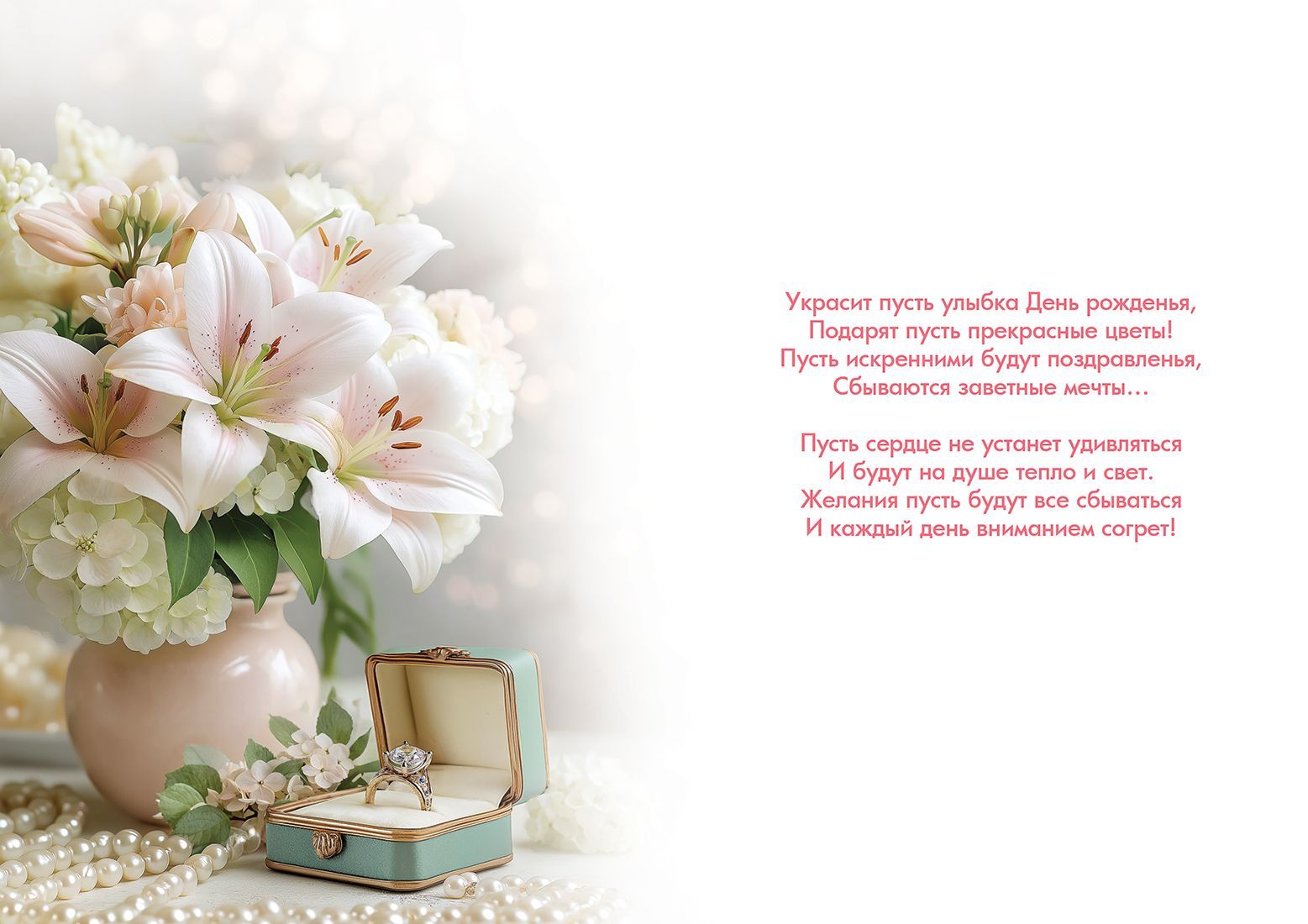 Открытка формата А4 предназначена для оформления поздравлений с днём рождения и рассчитана на использование как в розничных продажах, так и в оптовых поставках для магазинов, салонов подарков и корпоративных клиентов. Изделие изготовлено из плотного картона, обеспечивающего стабильную геометрию и сохранность формы при транспортировке, хранении и многократном перелистывании. Готовый размер открытки составляет 277 × 196 мм, что позволяет размещать её в стандартных конвертах соответствующего формата и использовать в качестве самостоятельного подарочного элемента. Лицевая сторона оформлена полноцветным изображением букета нежных лилий и декоративных цветов в пастельных тонах на мягком светлом фоне с акцентом на подарочной коробочке с кольцом; композиция дополнена надписью «В День Рождения!». Для усиления визуального эффекта применена отделка блестками в лаке радужными, за счёт чего отдельные элементы изображения и текста приобретают умеренный мерцающий эффект при различном угле освещения, что важно при выкладке товара на витрине и создании привлекательного ассортимента. Внутри предусмотрен готовый поздравительный текст, что сокращает время обслуживания клиентов и делает изделие удобным для покупателей, которым требуется быстрое и аккуратное оформление поздравления без дополнительной доработки. Плотный картон устойчив к изгибам и истиранию, не просвечивает, хорошо держит печать и лаковый слой, что снижает риск повреждений при оптовой логистике и фасовке. Открытка подходит для поздравления как в личном, так и в деловом формате, может использоваться в составе подарочных наборов, цветочных композиций и витринных экспозиций. В упаковке 10 штук, что удобно для планирования закупок, формирования полочного запаса и равномерного распределения по торговым точкам.