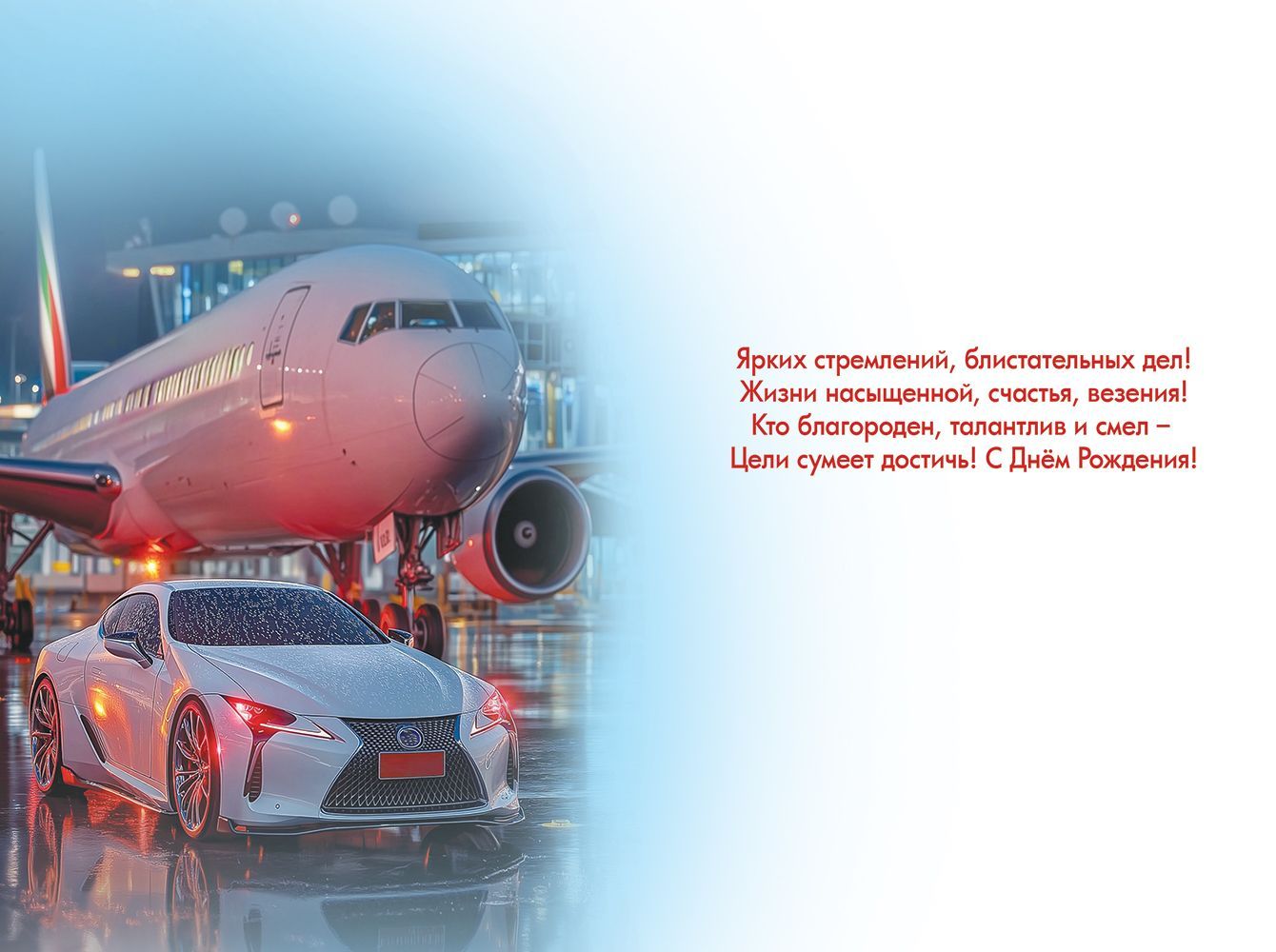 Открытка формата А5 выполнена из плотного картона и предназначена для оформления поздравлений с днём рождения. Лицевая сторона содержит полноцветное изображение современного самолёта и спортивного автомобиля на фоне ночного аэропорта, дополненное надписью «С днём рождения! ровного пути по своей взлётной полосе». Такая визуальная композиция подходит для поздравления мужчин и женщин, связанных с авиацией, транспортом, бизнесом или просто увлекающихся техникой и путешествиями. Печать выполнена с высоким разрешением, что обеспечивает чёткую детализацию и устойчивость изображения к выцветанию при стандартных условиях хранения. Дополнительная отделка — блестки в радужном лаке — подчёркивает световые блики на транспорте и создаёт аккуратный декоративный эффект без излишнего объёма, что удобно при штабелировании тиражей и транспортировке. Внутри открытки размещён поздравительный текст, позволяющий использовать изделие без необходимости самостоятельного написания обширного поздравления; при этом остаётся свободное место для личной подписи и даты. Габаритные размеры готового изделия составляют 182 × 122 мм, что соответствует стандартному варианту А5 в сложенном виде и упрощает подбор конвертов и упаковочных материалов на складе и в розничной продаже. Картон сохраняет геометрию при многоразовом перелистывании и не деформируется при кратковременных механических нагрузках, что важно при оптовых поставках и выкладке в торговом зале. Открытка поставляется в упаковке по 10 штук, что удобно для формирования ассортимента поздравительной группы, планирования полочного пространства и организации тематических выкладок к дням рождения в магазинах подарков, книжных и супермаркетах, а также для использования в корпоративных поздравлениях сотрудников и партнёров.