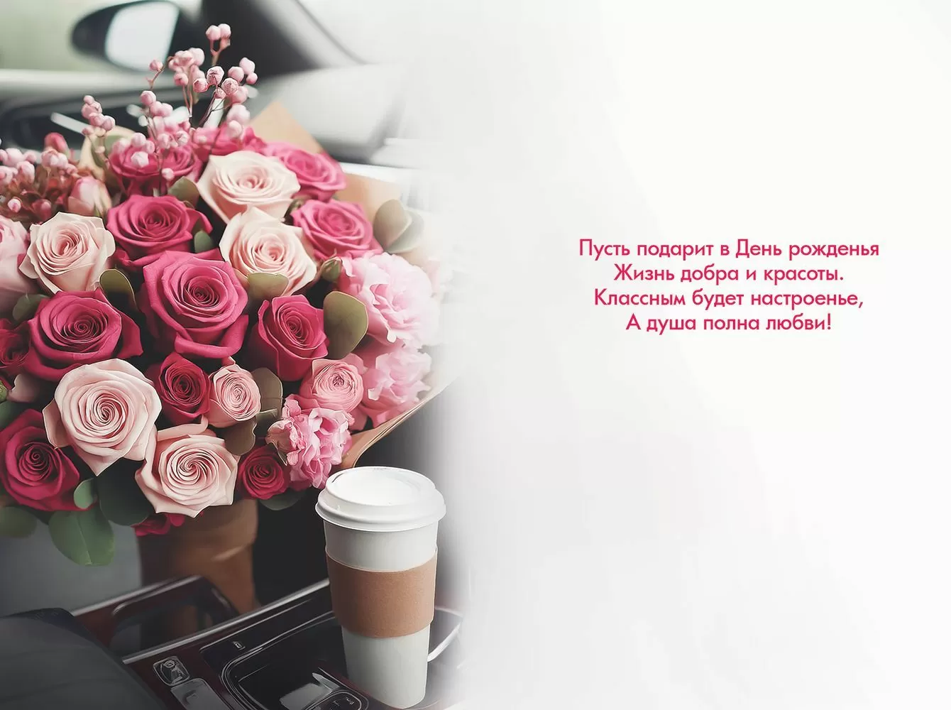 Открытка «С Днём рождения!» в формате А4 точно придется по вкусу стильным девушкам! Изделие украшено изображением роскошного, пышного букета цветов на фоне шикарного салона автомобиля. Дополняет композицию стаканчик кофе «на вынос», делая ее олицетворением жизни современной городской красавицы. Также изделие украшено роскошными золотыми блестками в лаке, придавая сияния и изыска. Внутри открытки – замечательные стихи с теплыми пожеланиями. Такой презент можно вручить в дополнение к основному подарку, чтобы украсить поздравление и сделать его более оригинальным. Изделие выполнено из качественных материалов, что обеспечивает ему прочность и долговечность, поэтому оно станет чудесным памятным сувениром для получателя.