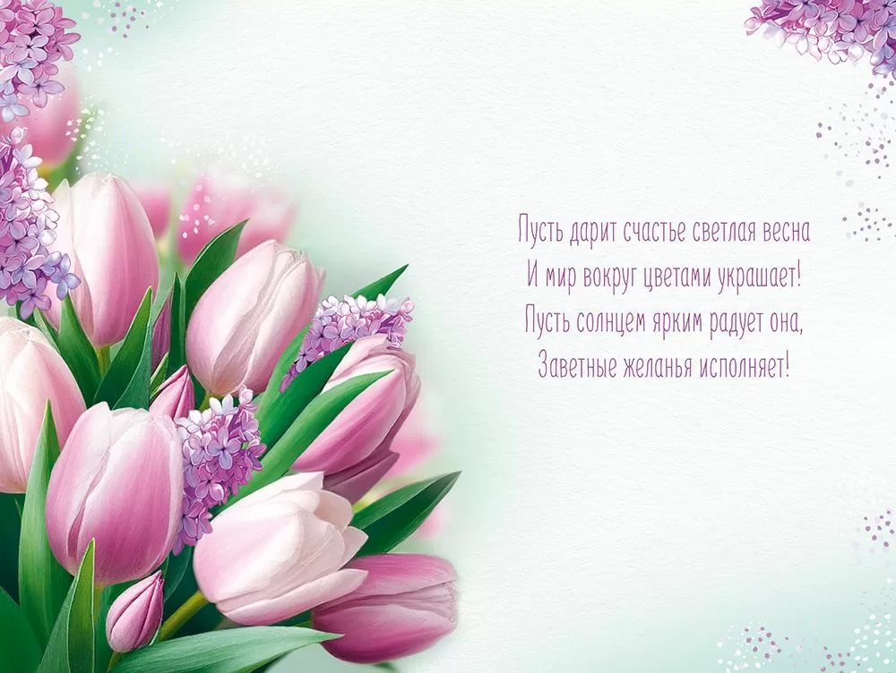 Открытка "8 Марта!" в формате А5 станет прекрасным дополнением к любому подарку. Ее женственное оформление сделает любое поздравление незабываемым! Изделие выполнено в мягких пастельных оттенках, с изображением нежных бело-розовых тюльпанов и благоухающей сирени, создающих весеннее настроение. Витиеватая надпись добавляет лёгкости и утончённости дизайну, вызывая чувство тепла и нежности. Внутри открытки – замечательные стихи с прекрасными пожеланиями. Такой презент можно вручить в дополнение к основному подарку, чтобы украсить поздравление и сделать его более оригинальным. Изделие выполнено из качественных материалов, что обеспечивает ему прочность и долговечность, поэтому оно станет чудесным памятным сувениром для получателя.