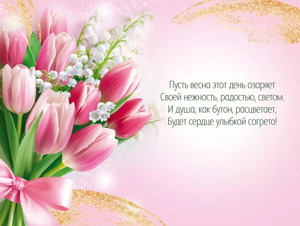 Открытка "8 Марта!" в формате А5 станет прекрасным дополнением к любому подарку. Ее цветочное оформление сделает любое поздравление незабываемым! Изделие украшает изысканный букет из розовых тюльпанов и ландышей, обвязанный бантом, с добавлением золотых акцентов, подчеркивающих её элегантность. Яркий и изящный шрифт надписи создает утончённый и торжественный вид, помогая общей композиции создать атмосферу предвкушения предстоящего праздника. Внутри открытки – замечательные стихи с прекрасными пожеланиями. Такой презент можно вручить в дополнение к основному подарку, чтобы украсить поздравление и сделать его более оригинальным. Изделие выполнено из качественных материалов, что обеспечивает ему прочность и долговечность, поэтому оно станет чудесным памятным сувениром для получателя.
