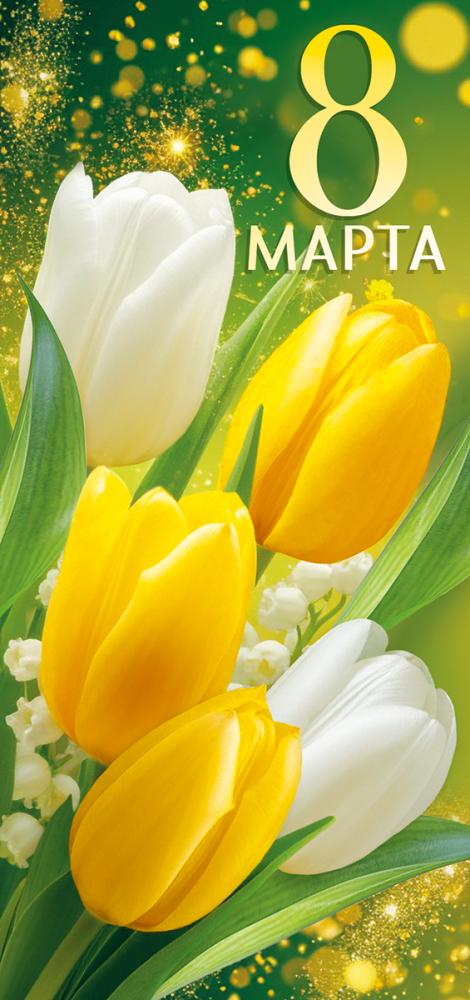 Открытка формата евро предназначена для оформления поздравлений к 8 Марта и может использоваться как самостоятельный поздравительный элемент или как дополнение к подарку. Изделие выполнено из плотного картона, что обеспечивает стабильную геометрию при хранении и транспортировке, устойчивость к изгибам и механическим воздействиям, а также аккуратный внешний вид при выкладке в торговом зале. Лицевая сторона оформлена полноцветным изображением жёлтых и белых тюльпанов на зелёном фоне с декоративными световыми эффектами и надписью «8 Марта», что делает открытку универсальной для поздравления коллег, партнёров, клиентов и частных адресатов. Применение глянцевого УФ-лака подчёркивает яркость красок, придаёт изображению выраженный блеск и повышает стойкость к истиранию, влаге и выгоранию, что важно при длительной сезонной выкладке и многократных перекладках в процессе оптовой логистики. Внутренняя сторона без текста, что даёт возможность использовать открытку в различных сценариях — от деловых нейтральных поздравлений до личных обращений, а также адаптировать содержание под фирменный стиль компании или конкретную целевую аудиторию. Готовое изделие имеет длину 204 мм и ширину 97 мм, что соответствует стандарту евроформата и позволяет без затруднений использовать типовые конверты, оптимизировать складское хранение и транспортировку крупными партиями. В упаковке 10 изделий, что удобно для планирования закупок, формирования ассортимента по категориям праздников и расчёта полочного пространства. Открытка подходит для розничной продажи поштучно и для комплексных оптовых поставок в магазины подарков, канцелярские и книжные сети, а также для корпоративных закупок в офисы и сервисные компании, где требуется единый визуальный стиль поздравлений.