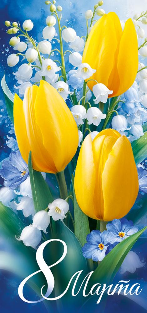 Открытка формата евро выполнена из плотного картона и ориентирована на использование в качестве универсального позиционируемого товара для поздравлений с 8 Марта в розничных и оптовых ассортиментных линейках. Лицевая сторона оформлена полноцветным изображением с реалистичной проработкой деталей: на синем фоне размещена композиция из жёлтых тюльпанов, ландышей и мелких голубых цветов, в нижней части расположен надпечатанный поздравительный текст «8 Марта». Внутри открытка без текста, что позволяет использовать её как для индивидуальных подписей, так и для тиражного корпоративного внесения поздравлений, логотипов или персонализированных посланий. Поверхность лицевой стороны дополнительно обработана глянцевым УФ-лаком, обеспечивающим стойкость к истиранию, повышенную яркость красок и устойчивость изображения к воздействию света при длительном хранении на витрине или складе. Размер готового изделия 204 × 97 мм обеспечивает совместимость с распространёнными конвертами евроформата и стандартными почтовыми отправлениями, а также удобство выкладки в торговых стойках и настольных дисплеях. Картонная основа сохраняет форму при транспортировке и многократных перегрузках, не деформируется при аккуратном хранении в стопах и обеспечивает стабильное качество партии. Открытка поставляется по 10 штук, что удобно для формирования заказов, планирования сезонных закупок и поддержания необходимого остатка в период повышенного спроса на праздничную полиграфию. Такое исполнение подходит для розничной продажи поштучно, комплектования подарков, использования в корпоративных поздравительных программах и как стандартная позиция весенней коллекции в канцелярском или сувенирном ассортименте.