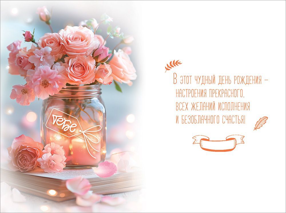 Открытка формата А5 предназначена для поздравления с днём рождения и ориентирована на использование в розничной продаже и оптовых поставках для торговых сетей, книжных магазинов, сувенирных отделов и интернет-площадок. Изделие изготовлено из плотного картона, обеспечивающего стабильную геометрию и сохранение формы при хранении, транспортировке и выкладке. Готовый размер открытки составляет 182 × 122 мм, что удобно для размещения в стандартных конвертах и на витринных полках. Лицевая сторона оформлена полноцветным изображением букета нежно‑розовых роз в стеклянной банке на фоне мягкого рассеянного света и декоративных лепестков, что делает открытку подходящей для широкого круга адресатов: родственников, коллег, партнёров, друзей. На лицевой стороне размещён печатный поздравительный текст «С днём рождения!» и дополнительная надпись «Сегодня никогда не повторится…», выполненные декоративным шрифтом. Изображение и надписи частично покрыты глянцевым УФ-лаком, за счёт чего отдельные элементы приобретают выраженный блеск, устойчивость к истиранию и дополнительную защиту от влаги и выцветания, что важно при длительном хранении на складе и под воздействием торгового освещения. Внутри открытки предусмотрен готовый поздравительный текст, позволяющий использовать изделие без дополнительной доработки, при этом остаётся свободное место для личной подписи и короткого пожелания. Конструкция рассчитана на многократное перелистывание без образования трещин по линии сгиба. Плотность картона оптимальна для машинной и ручной упаковки, сортировки и транспортировки крупными партиями. Универсальный праздничный сюжет и нейтральная цветовая гамма позволяют включать открытку в базовый ассортимент поздравительной продукции круглогодично, без привязки к сезонным коллекциям. В упаковке 10.