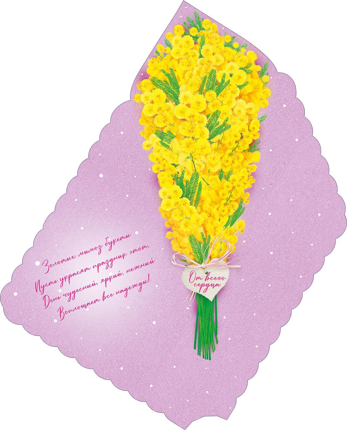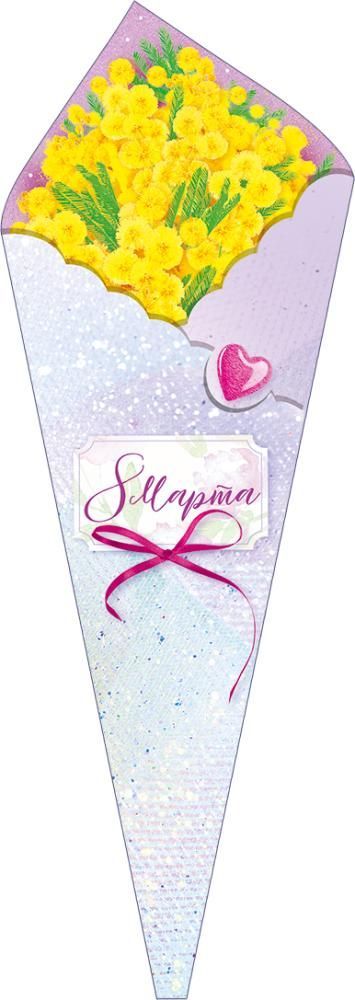 Открытка формата А4 с фигурной вырубкой выполнена из плотного картона, обеспечивающего устойчивость к сгибам и сохранение формы при транспортировке и выкладке в торговом зале. Готовое изделие имеет вытянутую треугольную конфигурацию, имитирующую букет цветов в упаковке, с длиной 325 мм и шириной 115 мм, что удобно для размещения в стандартных настольных и настенных витринах, а также для отправки в конвертах соответствующего формата. Лицевая сторона оформлена цветочным изображением с акцентом на жёлтые соцветия и декоративные элементы в виде сердечка и банта, что позволяет использовать открытку как универсальное поздравительное решение для весенних и праздничных дат, дней рождения, профессиональных и личных торжеств. Внутри предусмотрен печатный поздравительный текст, что сокращает время подготовки к продаже и упрощает выбор конечному покупателю, при этом остаётся свободное поле для личной подписи. Отделка выполнена с применением радужных блёсток в лаке, создающих мерцающий эффект при искусственном и дневном освещении; такая технология повышает износостойкость поверхности, защищает краску от истирания и делает изделие более устойчивым к случайным загрязнениям и лёгкой влажной уборке без интенсивного трения. Картонная основа совместима с большинством торговых стеллажей, не деформируется при вертикальном хранении и позволяет формировать плотные, устойчивые стопки для оптовых поставок и сезонных выкладок. Открытка поставляется по 10 штук в упаковке, что удобно для планирования ассортимента, формирования линейки поздравительных позиций и оптимизации складских остатков. Изделие подходит для розничной продажи поштучно, для корпоративных поздравлений, комплектования подарочных наборов и оформления тематических акций, обеспечивая единый визуальный стиль при массовых закупках.