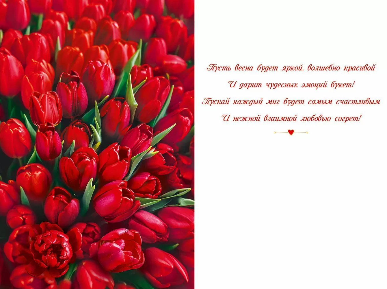Открытка «8 Марта» в формате А5 станет прекрасным дополнением к подарку и украсит собой самый весенний праздник. Волшебный дизайн в ярко-красных оттенках обязательно порадует каждую женщину! Открытка украшено изображениями чудесных тюльпанов, которые заполнили собой все пространство. Среди них расположена изящная прозрачная рамочка с поздравительной надписью. Внутри открытки – замечательные стихи с теплыми пожеланиями. Такой презент можно вручить в дополнение к основному подарку, чтобы украсить поздравление в честь Международного женского дня и сделать поздравление самым оригинальным. Изделие выполнено из качественных материалов, что обеспечивает ему прочность и долговечность, поэтому оно станет чудесным памятным сувениром для получательницы.