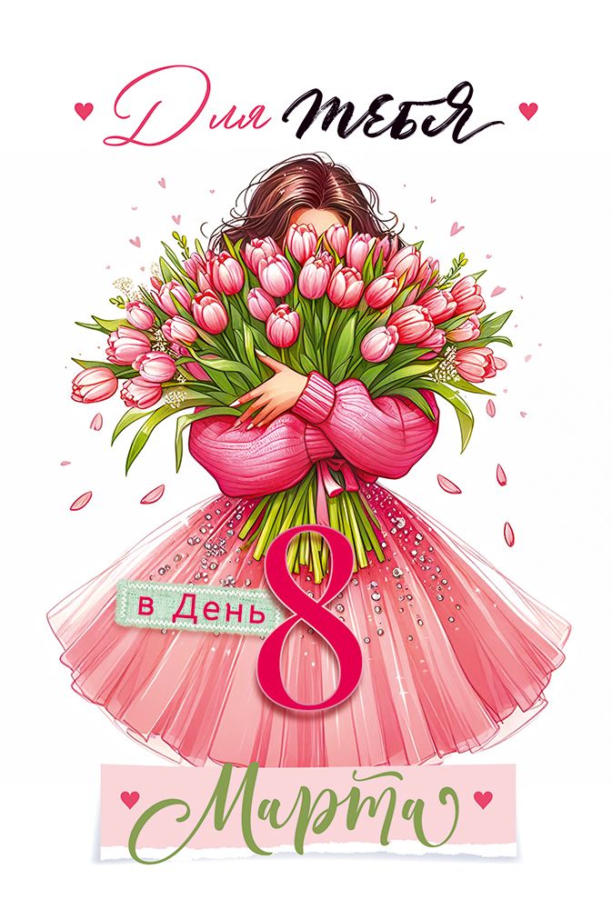 Открытка формата А5 предназначена для поздравления с 8 Марта и рассчитана на использование в розничной продаже и в оптовых поставках для магазинов, сетей и корпоративных закупок. Изделие изготовлено из плотного картона, обеспечивающего стабильную форму, аккуратный внешний вид и устойчивость к износу при транспортировке и хранении в коробах и на витрине. Лицевая сторона оформлена цветной печатью с изображением девушки с большим букетом розовых тюльпанов и надписями «Для тебя» и «в День 8 Марта», что делает открытку универсальной для поздравления женщин разного возраста и статуса: коллег, партнеров, клиентов, родственников. Поверхность дополнительно обработана глянцевым УФ-лаком, за счет чего изображение приобретает выразительность, устойчивость к истиранию и меньшую восприимчивость к случайным загрязнениям, что важно при многократном перекладывании товара и выкладке в местах массового спроса. Внутри размещен заранее напечатанный поздравительный текст, позволяющий использовать открытку без дополнительной подготовки, что удобно при корпоративных раздачах и массовых праздничных акциях; при необходимости остается место для личной подписи. Готовое изделие имеет длину 182 мм и ширину 122 мм, параметры соответствуют стандартному А5 и позволяют хранить и транспортировать открытки в типовых коробах и пакетах, а также использовать стандартные почтовые конверты соответствующего формата. В упаковке 10 штук, что удобно для формирования упорядоченного ассортимента по праздникам и планирования закупок с учетом сезонного спроса. Дизайн ориентирован на весеннюю тематику, подходит для оформления подарков, цветочных букетов и подарочных наборов, а также для использования в офисах и торговых точках в составе праздничных предложений.