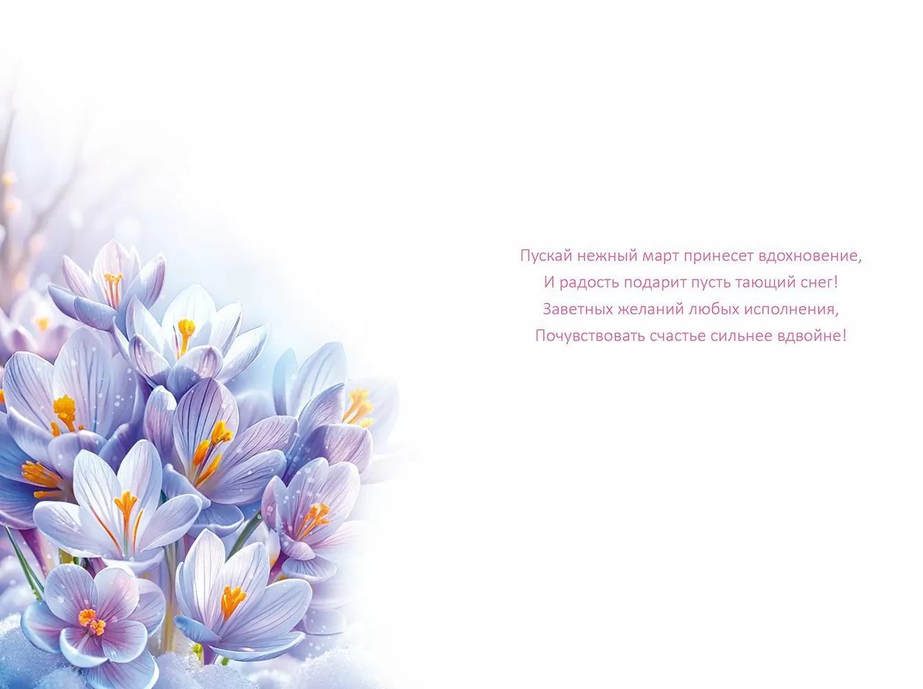 Открытка «8 Марта. Нежности и красоты!» в формате А5 станет прекрасным дополнением к подарку и украсит собой самый весенний праздник. Чудесный дизайн в ярких фиолетовых оттенках обязательно порадует каждую женщину, девушку или девочку! На переднем плане выглядывают из-под снега нежные цветочки. А на фоне изображены голые веточки с только-только распускающимися почками. На одной из веток сидит необычная розовая птичка. Все изображение пронизано внутренним светом и предвкушением весны. Внутри открытки – замечательные стихи с теплыми пожеланиями. Такой презент можно вручить в дополнение к основному подарку, чтобы украсить поздравление в честь Международного женского дня и сделать поздравление самым оригинальным. Изделие выполнено из качественных материалов, что обеспечивает ему прочность и долговечность, поэтому оно станет чудесным памятным сувениром для получательницы.