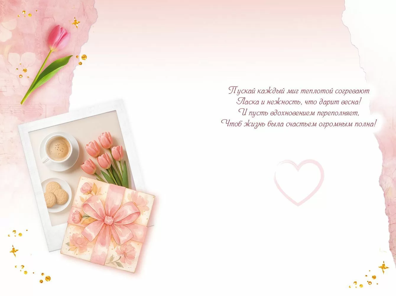 Открытка «8 Марта» в формате А5 станет прекрасным дополнением к подарку и украсит собой самый весенний праздник. Романтичный дизайн обязательно порадует каждую женщину! Букетик розовых тюльпанов с кружевным бантиком делает изображение особенно привлекательным и нежным. Стильный коллаж на фоне выполнен в лучших трендовых традициях. Внутри открытки – замечательные стихи с теплыми пожеланиями. Такой презент можно вручить в дополнение к основному подарку, чтобы украсить поздравление в честь Международного женского дня и сделать поздравление самым оригинальным. Изделие выполнено из качественных материалов, что обеспечивает ему прочность и долговечность, поэтому оно станет чудесным памятным сувениром для получательницы.