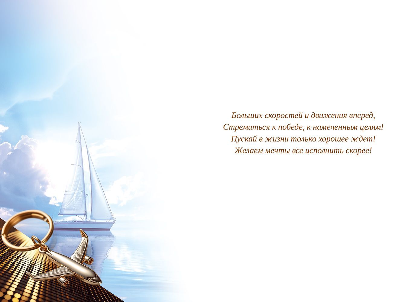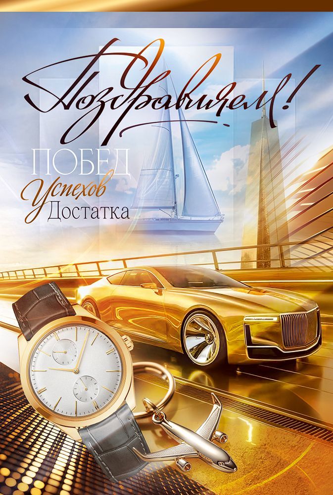 Открытка формата А5 предназначена для поздравления с личными и профессиональными достижениями и ориентирована на использование в деловой и частной среде. Основа изделия — плотный картон, обеспечивающий устойчивость к изгибам, сохранность формы и внешнего вида при хранении, транспортировке и многократном перелистывании. Глянцевый УФ-лак наносится на лицевую сторону, усиливая насыщенность цветов, создавая износостойкое покрытие и защищая изображение от истирания и выгорания при стандартных условиях эксплуатации. На лицевой стороне размещена композиция с автомобилем, часами, парусной яхтой и самолетом на фоне современного города, а также поздравительная надпись «Поздравляем! Побед, успехов, достатка», что делает открытку уместной для поздравлений с повышением, успешным завершением проекта, юбилеем, профессиональным праздником или другим событием, связанным с карьерным ростом и финансовыми достижениями. Внутри предусмотрен печатный текст, позволяющий использовать изделие без дополнительной доработки, при необходимости оставляя свободное место для краткого персонального обращения от дарителя. Габаритные размеры готового изделия 182 × 122 мм обеспечивают совместимость с распространёнными форматами конвертов и удобство размещения в стандартных витринах и стендах. Плотный картон и лаковая поверхность способствуют аккуратному внешнему виду при пакетной отгрузке и складском хранении, снижают риск повреждений при транспортировке крупными партиями. Упаковка содержит 10 открыток, что удобно для формирования ассортимента в розничных точках, корпоративных закупок для поздравления сотрудников и партнёров, а также для использования в качестве универсального поздравительного решения в офисах и сервисных компаниях.