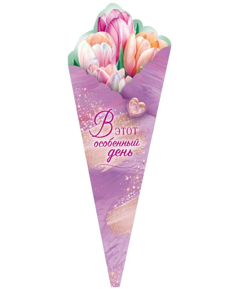 Открытка формата А4 с фигурной вырубкой выполнена из плотного картона и предназначена для оформления поздравлений в розничном и оптовом ассортименте. Готовое изделие имеет вытянутую конусообразную форму длиной 325 мм и шириной 115 мм, что удобно для выкладки на стендах, в напольных и настольных дисплеях, а также для размещения в стандартных коробах при складском хранении и транспортировке. Лицевая сторона оформлена композиционным изображением букета тюльпанов в стилизованной «обертке» с надписью «В этот особенный день», что делает открытку универсальной для поздравлений с днем рождения, юбилеем, личными и календарными праздниками. Внутри размещен готовый поздравительный текст, позволяющий использовать изделие без дополнительной доработки, что снижает временные затраты при массовой выдаче поздравлений в организациях, учебных заведениях и торговых точках. Отделка выполнена радужными блестками в лаке, создающими устойчивый декоративный эффект при искусственном и дневном освещении; покрытие фиксирует блестки на поверхности, уменьшает истираемость и повышает износостойкость изделия при транспортировке и многократных касаниях. Картон сохраняет геометрию формы, не деформируется при аккуратном хранении в стопах и подходит для длительного складского запаса. Открытка совместима с большинством стандартных пакетов и подарочных пакетов по высоте, ее удобно комбинировать с цветами, сувенирами и мягкими игрушками, формируя единый подарочный комплект. В упаковке 10 штук, что оптимально для формирования полочного ассортимента, планирования закупок по сериям и поддержания стабильного наличия позиции в торговой сети.