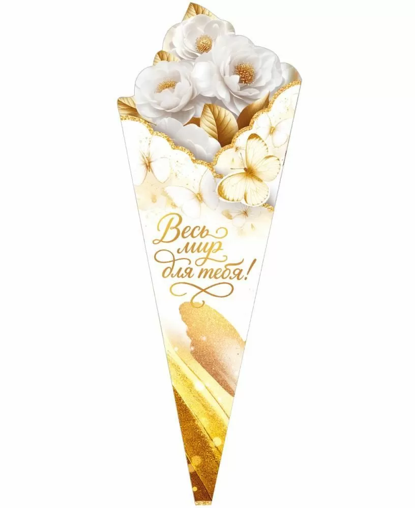 Открытка «Весь мир для тебя!» в размере А4 и в оригинальном складном формате точно вызовет восхищение у получательницы и преобразит любое торжество! В сложенном виде изделие выглядит как букет нежных белых цветов в бело-золотой обертке с изображением чудесных бабочек, одна из которых играет роль своеобразной застежки и раскрывает внутреннюю сторону «букета» с приятными, вдумчивыми пожеланиями. Открытка выполнена из прочного материала, имеет высокое качество печати и дополнительные инкрустации в виде радужных блесток в лаке, который предупреждает их обсыпание или отслаивание – всё это делает ее прекрасным и долговечным памятным сувениром.