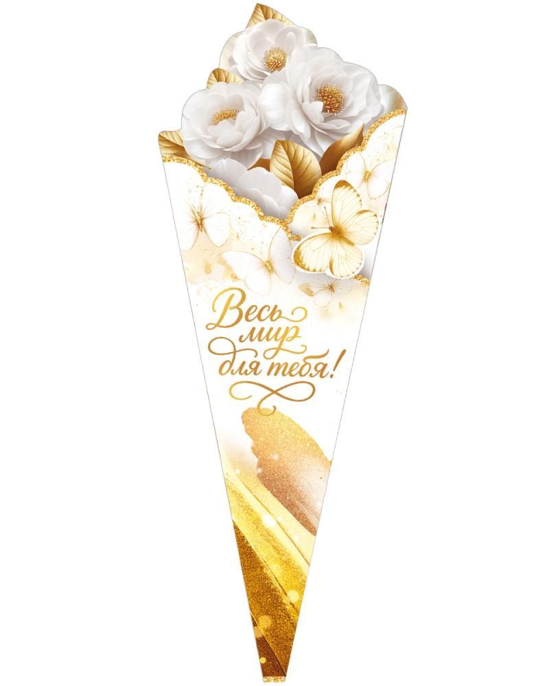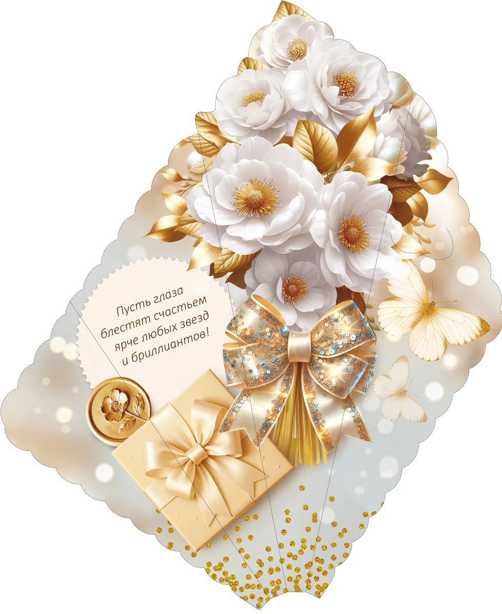 Открытка формата А4 с фигурной вырубкой выполнена из плотного картона, что обеспечивает стабильную геометрию изделия при транспортировке и выкладке в торговом зале. Готовое изделие имеет вытянутую конусообразную форму длиной 325 мм и шириной 115 мм, рассчитано на использование как самостоятельная поздравительная открытка и как декоративное дополнение к подарку или цветочной композиции. Лицевая сторона оформлена изображением белых цветов и бабочек в золотисто-белой гамме с надписью «Весь мир для тебя!», что делает открытку универсальной для поздравлений с днем рождения, юбилеем, личными и календарными праздниками. Отделка выполнена блестками в лаке радужными, создающими мерцающий эффект при искусственном и дневном освещении; покрытие фиксировано на поверхности и при соблюдении стандартных условий хранения не осыпается, что важно для оптовых поставок и длительного оборота товара. Плотность и структура картона позволяют открытке сохранять форму при размещении в напольных и настольных дисплеях, в стеллажах и кассовых зонах, а также при пересылке в почтовых отправлениях соответствующего формата. Внутри предусмотрен печатный текст поздравительного характера, что сокращает время обслуживания розничного покупателя и упрощает выбор готового решения без необходимости самостоятельного написания развернутого поздравления. Открытка удобна для хранения и учета на складе: плоская форма и однородный материал позволяют формировать ровные стопы, минимизируя риск деформации краев. В упаковке 10 изделий, что оптимально для розничных сетей, сувенирных и цветочных магазинов, а также для корпоративных закупок, когда требуется единый стиль поздравления для группы получателей. Такое исполнение подходит для использования в ассортименте премиального и стандартного ценового сегмента, легко комбинируется с подарочными пакетами и лентами в золотисто-белой гамме и обеспечивает стабильное визуальное качество на витрине.