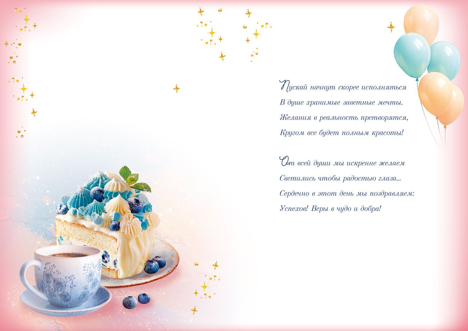 Открытка формата А4 изготовлена из плотного картона, обеспечивающего стабильную геометрию изделия при хранении, транспортировке и выкладке в торговом зале. Прямоугольная форма с готовыми размерами 277 × 196 мм удобна для размещения в стандартных конвертах и на витринных стендах. Лицевая сторона оформлена полноцветным изображением цветочной композиции в корзине, десерта и чайной пары, дополненным поздравительной надписью «Поздравляем!» и пожеланием «Исполнения всех желаний!», что делает изделие универсальным решением для дней рождения, семейных торжеств, корпоративных поздравлений и других праздничных поводов. Печатное оформление выполнено с применением радужных блесток в лаке, создающих аккуратные акценты без излишнего объёма и не нарушающих возможность компактного штабелирования при оптовой поставке. Внутри открытки предусмотрен готовый поздравительный текст, что сокращает время подготовки к вручению и удобно как для розничных покупателей, так и для организаций при массовой раздаче. Картонная основа устойчива к деформации, не просвечивает, сохраняет насыщенность красок и декоративный эффект при длительном хранении на складе и в торговом обороте. Поверхность открытки гладкая, пригодна для дополнительных рукописных пожеланий стандартными шариковыми и гелевыми ручками без растекания чернил. Оптимальная толщина материала и точность реза способствуют аккуратному внешнему виду в упаковке и при раздаче, а также позволяют формировать устойчивые стопки при фасовке и транспортировке. В упаковке 10 штук, что удобно для планирования закупок, формирования ассортимента поздравительной продукции и комплектования партий для розничных точек и корпоративных клиентов.