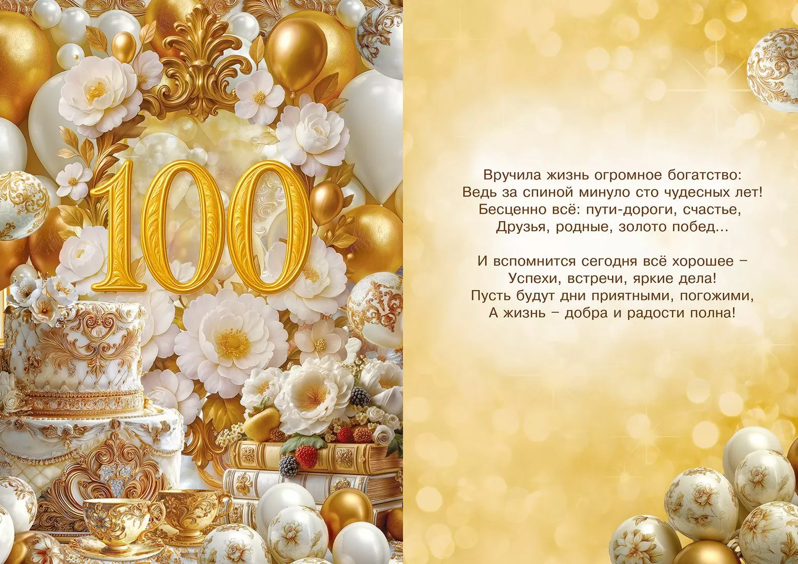 Открытка "С Юбилеем! 100 лет" в формате А4 станет прекрасным дополнением к любому подарку. Изделие выполнено в царственных бело-золотых цветах и украшено изображением роскошной композиции со спелыми ягодами, потрясающим многоярусным праздничным тортом, воздушными шарами и изящными фарфоровыми чашками с тонкими узорами. Также оно инкрустировано радужными блестками в лаке, который предупреждает их обсыпание или отслаивание. Такое оформление делает изделие многогранным, приковывающим к себе взгляд и достойным такого чудесного повода! Внутри открытки – замечательные стихи с теплыми пожеланиями. Данный презент можно вручить в дополнение к основному подарку, чтобы украсить поздравление и сделать его более оригинальным. Изделие выполнено из качественных материалов, что обеспечивает ему прочность и долговечность, поэтому оно станет чудесным памятным сувениром для получателя.