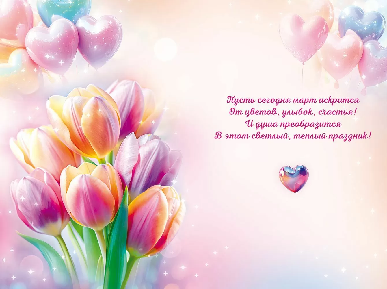 Открытка «8 Марта» в формате А5 станет прекрасным дополнением к любому подарку. Красочное оформление изделия сделает любое поздравление незабываемым! Дизайн украшен нежными тюльпанами в пастельных тонах, создающими атмосферу уюта и тепла. Вверху расположена поздравительная надпись с плавными витковыми буквами, а внизу — надпись "Счастья!", окруженная сердечком, добавляющим романтический акцент. Также изделие инкрустировано радужными блестками в лаке, который предупреждает их обсыпание или отслаивание, а внутри находятся замечательные стихи с теплыми пожеланиями. Данный презент можно вручить в дополнение к основному подарку, чтобы украсить поздравление и сделать его более оригинальным. Изделие выполнено из качественных материалов, что обеспечивает ему прочность и долговечность, поэтому оно станет чудесным памятным сувениром для получателя.