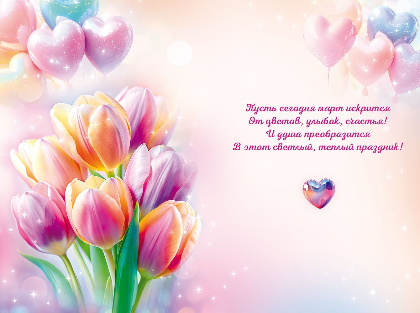Открытка формата А5 предназначена для поздравления с 8 Марта и рассчитана на использование в розничной продаже и оптовых поставках для торговых сетей, офисов и корпоративных клиентов. Изделие выполнено из плотного картона, обеспечивающего стабильную геометрию и устойчивость к изгибам при хранении и пересылке. Готовый размер открытки составляет 182 × 122 мм, что удобно для стандартных почтовых конвертов и выкладки на полке. На лицевой стороне размещена полноцветная композиция с тюльпанами и декоративными сердцами в мягкой пастельной гамме, с надписями «8 Марта» и «Счастья!». Изображение дополнено блестками в лаке радужного эффекта, за счет чего поверхность имеет износостойкое декоративное покрытие, устойчивое к истиранию при многократном контакте и трении в стопе при транспортировке. Внутри предусмотрен готовый поздравительный текст, что снижает временные затраты конечного пользователя и делает изделие удобным для массовых поздравлений сотрудников, клиентов или партнеров. Плотный картон позволяет открытке сохранять форму при вертикальной демонстрации на витрине и при размещении в настольных держателях. Открытки упакованы по 10 штук, что оптимально для планирования закупок, формирования товарных запасов и равномерной выкладки по торговым точкам. Компактный формат и ровные края облегчают штабелирование и упаковку в коробки стандартных размеров, уменьшая риск повреждений при логистике. Открытка подходит для использования как самостоятельный поздравительный элемент, так и в составе подарочных наборов, цветочных композиций и корпоративных подарков, обеспечивая единый визуальный стиль оформления к Международному женскому дню.
