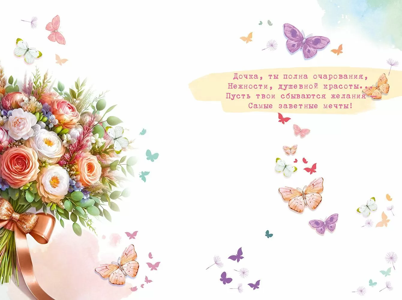 Открытка «Любимой дочке» в формате А5 станет прекрасным дополнением к любому подарку! Изделие оформлено в пастельных тонах, с нежным букетом прекрасных цветов, украшенных зелеными листьями и блестящим бантом, а также множеством летящих бабочек, которые создают ощущение легкости и воздушности. Яркая надпись и трогательное сообщение внизу дополняют общий теплый и заботливый тон дизайна. Также изделие инкрустировано радужными блестками в лаке, который предупреждает их обсыпание или отслаивание, а внутри находятся замечательные стихи с теплыми пожеланиями. Такой презент можно вручить в дополнение к основному подарку, чтобы украсить поздравление и сделать его более оригинальным. Изделие выполнено из качественных материалов, что обеспечивает ему прочность и долговечность, поэтому оно станет чудесным памятным сувениром для получателя.