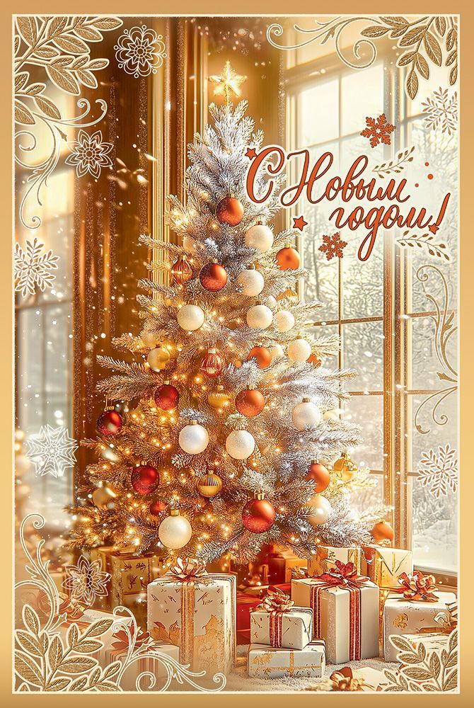 Открытка «С Новым годом!» в формате А5 станет прекрасным дополнением к подарку и украсит любое поздравление. Новогодний сюжет, изображенный на изделии, никого не оставит равнодушным. В центре композиции – нарядная елка, украшенная светящейся гирляндой и красными и белыми шариками. Под этой елочкой целая куча подарков в красивых коробочках. Дополняют яркий дизайн узоры и вензеля. Внутри открытки – замечательные стихи с теплыми пожеланиями. Такой презент можно вручить в дополнение к основному подарку, чтобы украсить поздравление и сделать его более оригинальным. Изделие выполнено из качественных материалов, что обеспечивает ему прочность и долговечность, поэтому оно станет чудесным памятным сувениром для получателя.