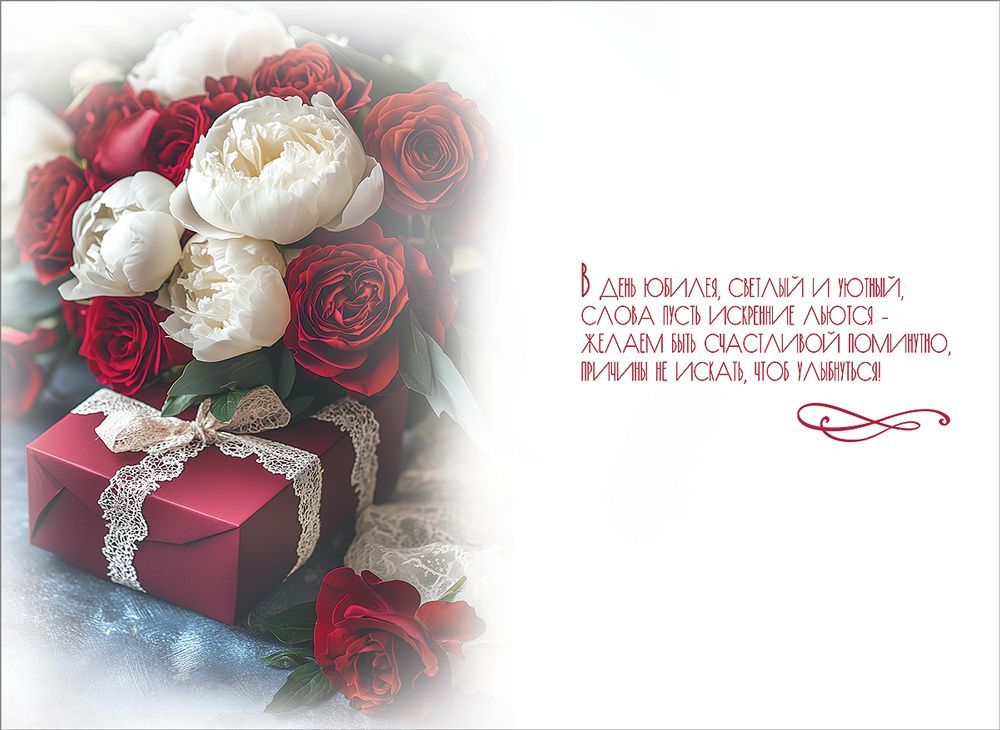 Открытка формата А5 предназначена для поздравления с юбилеем и ориентирована на использование в розничной продаже и оптовых поставках для магазинов подарков, книжных сетей и корпоративных закупок. Изделие изготовлено из плотного картона, обеспечивающего устойчивость к механическим воздействиям и сохранение формы при длительном хранении, транспортировке и многократном перекладывании в торговом зале. Лицевая сторона оформлена изображением подарочной коробки бордового цвета с кружевной лентой и букетом из бордовых роз и белых пионов, что делает открытку уместной для поздравления взрослых адресатов, в том числе в деловой и корпоративной среде. Поверхность дополнительно обработана глянцевым УФ-лаком, за счёт чего изображение приобретает выраженную четкость и устойчивость к истиранию, не выцветает при экспонировании на витрине и выдерживает контакт с руками без заметных следов. Внутри размещен поздравительный текст, позволяющий использовать изделие без необходимости самостоятельного написания развернутого поздравления, что сокращает время обслуживания покупателей и упрощает выбор для конечного пользователя. Габариты готового изделия составляют 182 × 122 мм, что соответствует стандартному почтовому формату и удобно для размещения в конвертах, пакетах и подарочных наборах. Размеры подобраны таким образом, чтобы открытку было легко интегрировать в ассортиментную матрицу: она совместима с типовыми витринными карманами и настольными стойками, укладывается в стандартные транспортные короба, не требует нестандартных условий хранения. Плотный картон устойчив к изгибам, не деформируется при вертикальной выкладке и обеспечивает аккуратный внешний вид на протяжении всего срока реализации. В упаковке 10 штук, что удобно для формирования заказов, учета остатков и планирования выкладки по тематикам праздников и юбилейных дат.