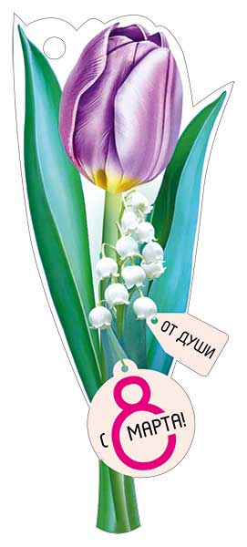 Открытка формата А6 выполнена из плотного картона с фигурной вырубкой по контуру цветочной композиции, что обеспечивает аккуратный внешний вид и стабильную форму при хранении и транспортировке. Изделие имеет вытянутую вертикальную конфигурацию длиной 118 мм и шириной 50 мм, что удобно для выкладки в стандартных настольных и настенных дисплеях, а также для размещения в цветочных букетах и подарочных наборах. Лицевая сторона оформлена полноцветным изображением тюльпана и ландышей с уже нанесёнными поздравительными элементами «С 8 Марта!» и «От души», что позволяет использовать открытку как готовый праздничный акцент без дополнительного декорирования. Поверхность покрыта глянцевым УФ-лаком, повышающим стойкость красочного слоя к истиранию, влаге и выцветанию, что важно при интенсивной розничной эксплуатации, частых перекладках и транспортировке в составе крупной партии товара. Внутренняя сторона без текста, с чистым полем для самостоятельного нанесения поздравления, фирменного штампа или краткой служебной информации, что делает открытку универсальной для использования как в розничных продажах, так и в корпоративных поздравительных программах. Небольшое отверстие в верхней части позволяет крепить изделие к подарочной упаковке, букеты и сувенирной продукции с помощью ленты или шнура, упрощая формирование комплексных подарочных решений. Компактный размер и картонная основа обеспечивают удобство складского хранения: открытки легко штабелируются, не деформируются в стандартных коробах и подходят для длительного хранения без потери внешнего вида. В упаковке 20 штук, что оптимально для планирования оптовых закупок, формирования сезонного ассортимента к 8 Марта и быстрой дозагрузки полочного пространства на торговых точках различного формата.