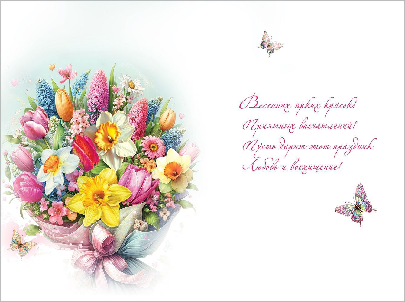 Открытка формата А5 предназначена для поздравления с 8 Марта и ориентирована на использование в розничной продаже и в оптовых поставках для сетей, магазинов подарков, киосков и корпоративных заказчиков. Изделие изготовлено из плотного картона, обеспечивающего стабильную геометрию при хранении и транспортировке, а также устойчивость к изгибам и истиранию при выкладке в торговом зале. Лицевая сторона оформлена полноцветной печатью с ярким букетом весенних цветов и крупной надписью «8 Марта», что делает открытку универсальной для поздравления женщин разных возрастов в бытовых и корпоративных сценариях: для вручения сотрудницам, клиентам, партнёрам или в частных поздравлениях. Размер готового изделия 182 × 122 мм позволяет удобно размещать открытку в стандартных витринах и напольных или настольных стойках, а также использовать её с типовыми конвертами соответствующего формата. Поверхность дополнительно обработана глянцевым УФ-лаком, за счёт чего изображение приобретает выраженную защиту от истирания, выцветания и локальных загрязнений, что особенно важно при активной перекладке товара и длительном хранении на складе. Внутри предусмотрен готовый печатный текст поздравления, что сокращает время подготовки к вручению и снижает нагрузку на персонал при массовых поздравлениях. В упаковке 10 одинаковых открыток, что удобно для планирования закупок, формирования однородной выкладки и расчёта остатка по артикулу. Конструкция изделия не требует дополнительных элементов сборки, открытка легко раскрывается и фиксируется в закрытом положении, не деформируясь при многократном использовании в демонстрационных целях. Такое исполнение обеспечивает стабильное качество партии, предсказуемость потребительских свойств и удобство интеграции в ассортимент сезонных праздничных товаров.